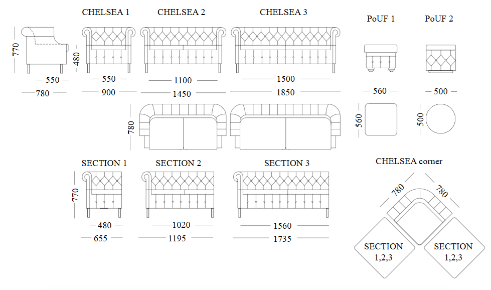Челсі - диван у класичному стилі, виготовлений за традиційними канонами. Він досконалий у всьому: спинка і підлокітники виконані в техніці "капітоне", передня частина царги прикрашена складками з ґудзиками, опори виготовлені з натуральної деревини. Це модель для інтер'єру "класика" - чи то квартира, чи то заміський будинок, чи то ресторан, готель, бутік, салон краси або навіть офіс солідної компанії. Вона також стане альтернативою популярній моделі "честерфілд". Серія складається з крісла, дво-, тримісного дивана, трьох секцій різного розміру, з'єднувального елемента "кут" і двох видів пуфів. Ви можете замовити ідеального "напарника" своїм меблям, який не порушить цілісність простору.