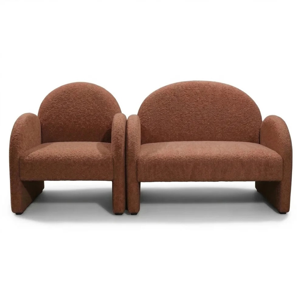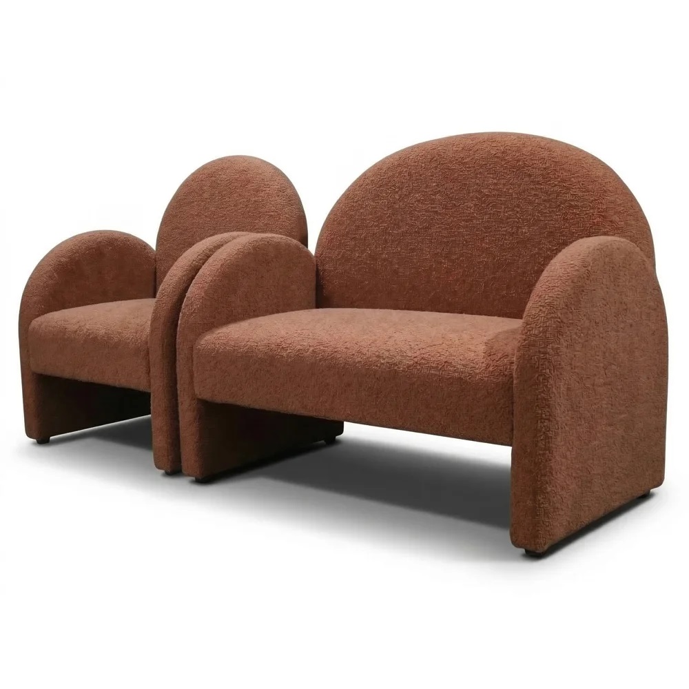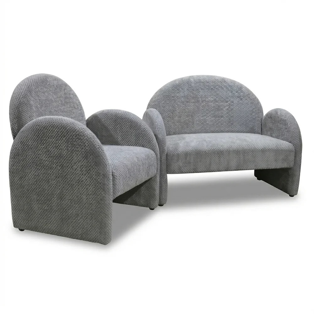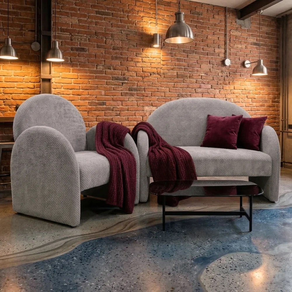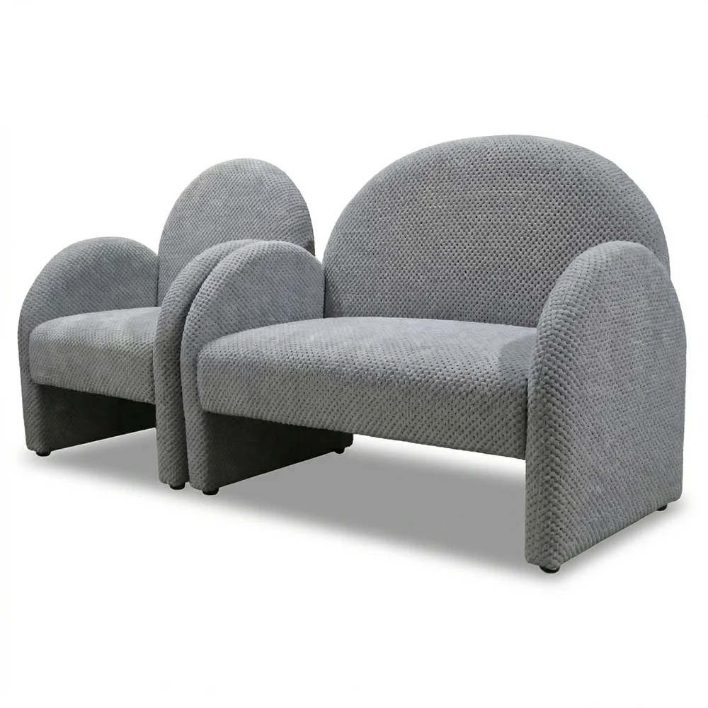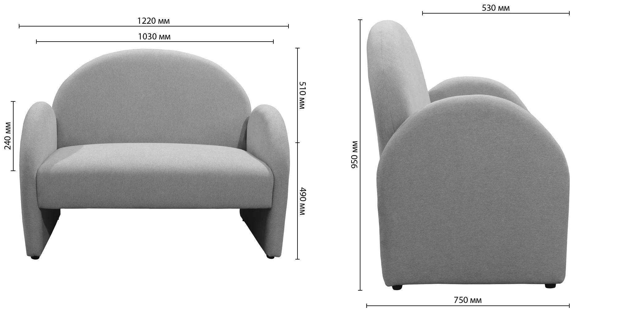Округлі підлокітники та спинка створюють м’який, «обіймаючий» силует, а приховані ніжки забезпечують візуальну легкість конструкції. Посадка комфортна й досить глибока — ідеальна для відпочинку на двох.