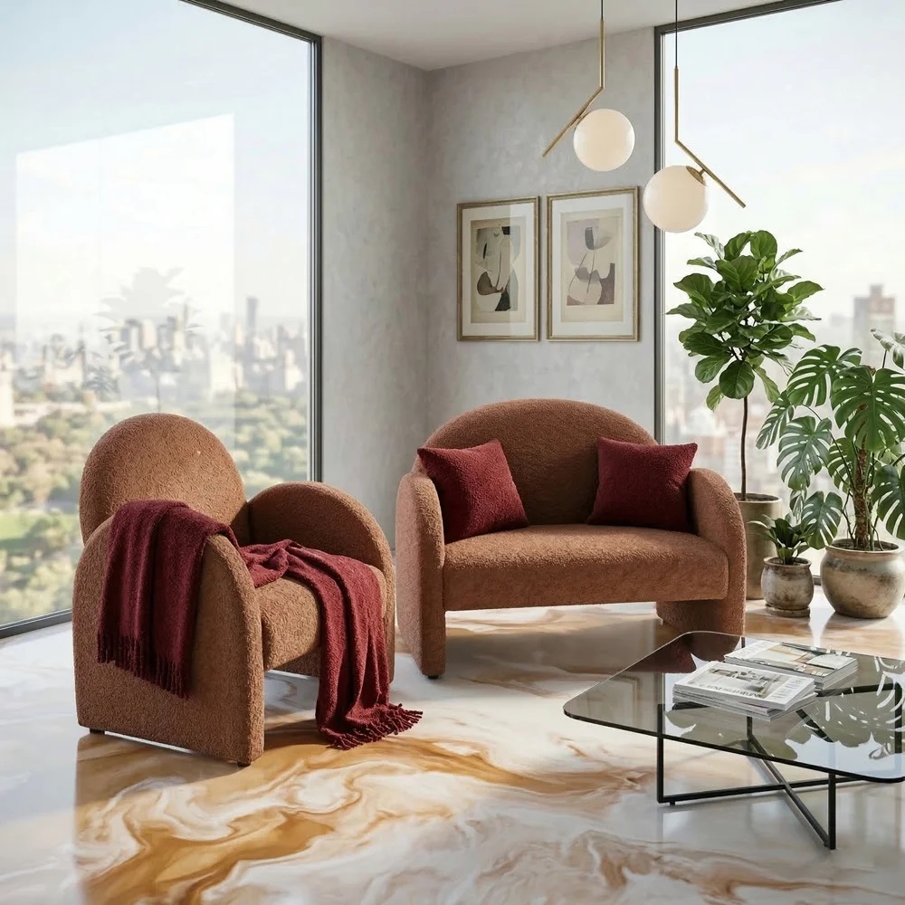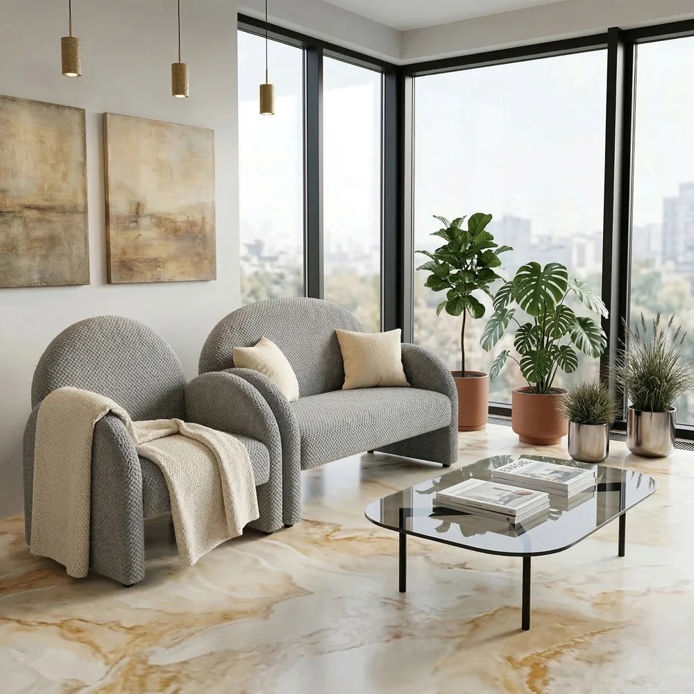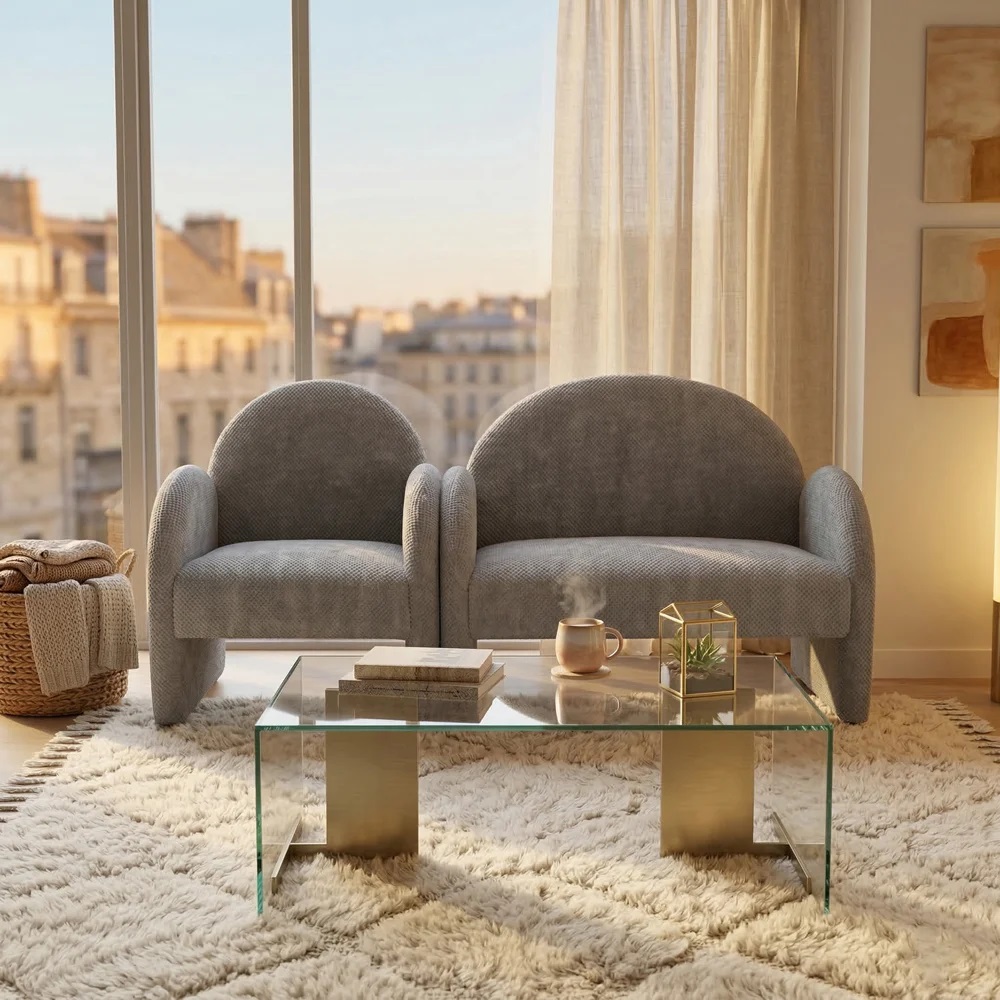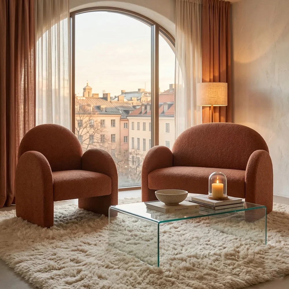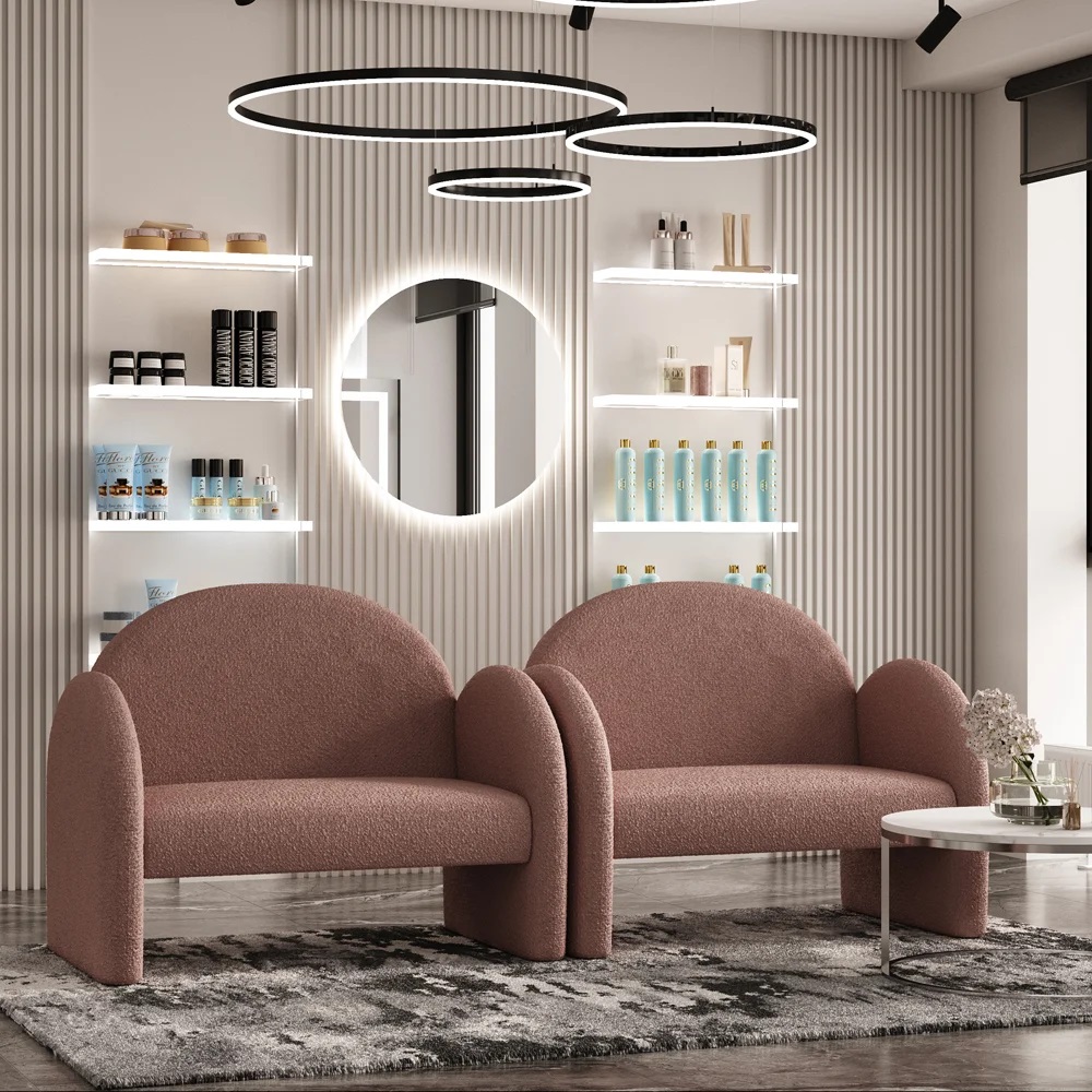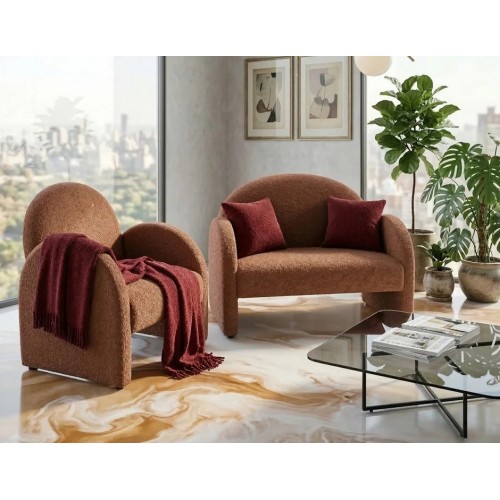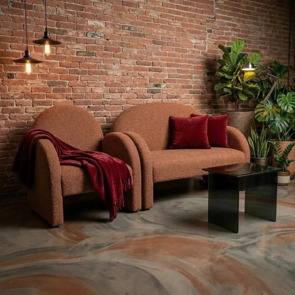 Округлі підлокітники та спинка створюють м’який, «обіймаючий» силует, а приховані ніжки забезпечують візуальну легкість конструкції. Посадка комфортна й досить глибока — ідеальна для відпочинку на двох.