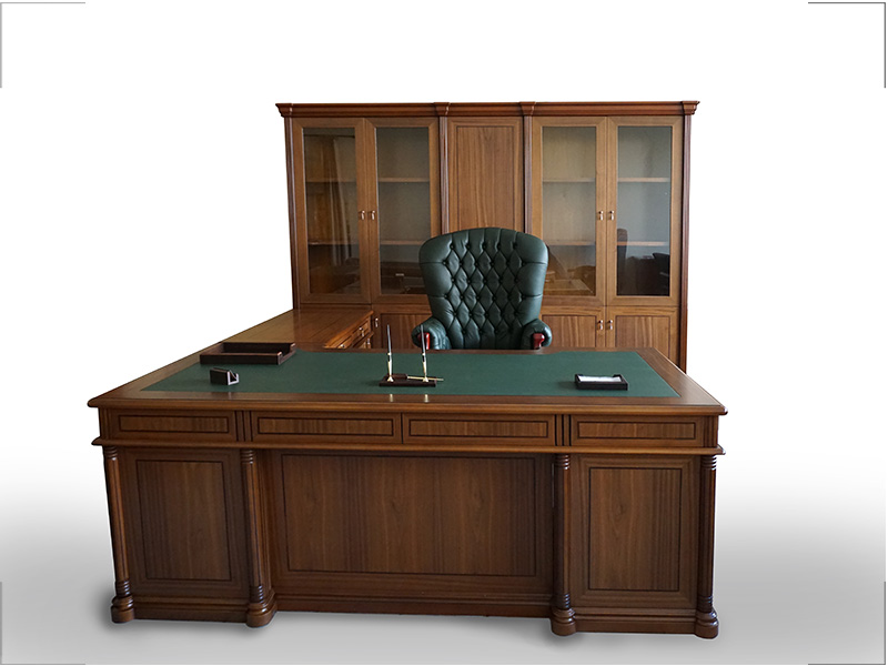 Всі меблі виготовлені з натуральних матеріалів. Основа деталей – плита МДФ вкрита натуральним шпоном лісового горіха. Лицьові частини столу мають покриття лаком у п'ять шарів. Поверхня столу керівника має фігурну вставку зі шкіри темно-зеленого кольору, яка забезпечує комфорт при роботі за столом. Усі поверхні столу та внутрішні відділення ящиків столу покриті натуральним шпоном. На висувних ящиках використовуються телескопічні напрямні повного висування, які забезпечують стійке висування та чудово переносять навантаження. Різьблені елементи класичного кабінету Франциск виконані з масиву дерева і надають столу строгість і солідність.