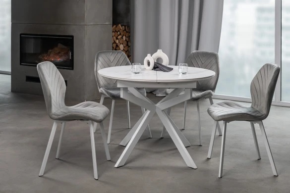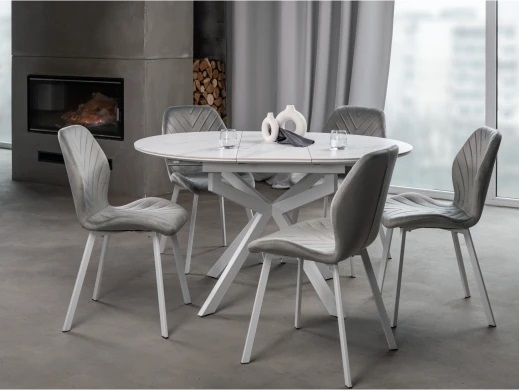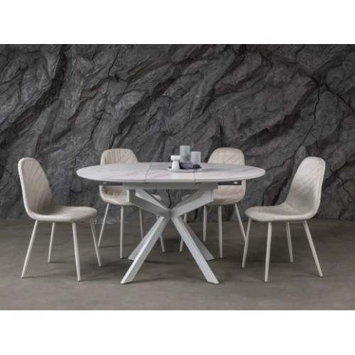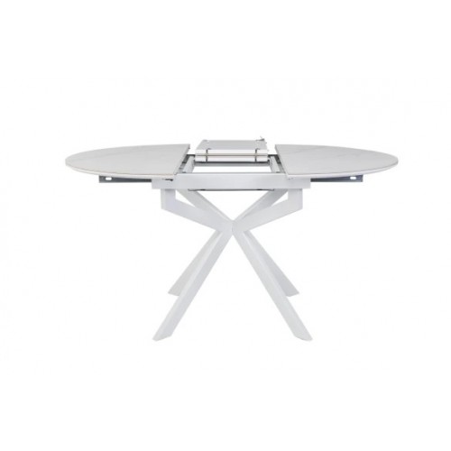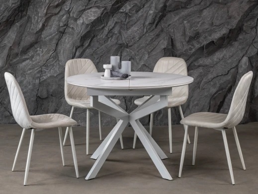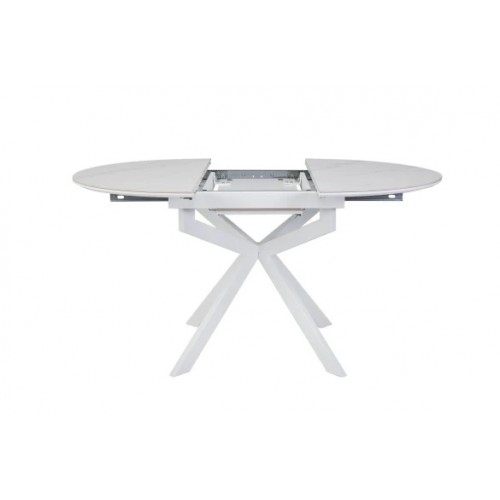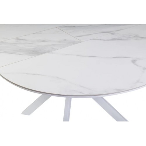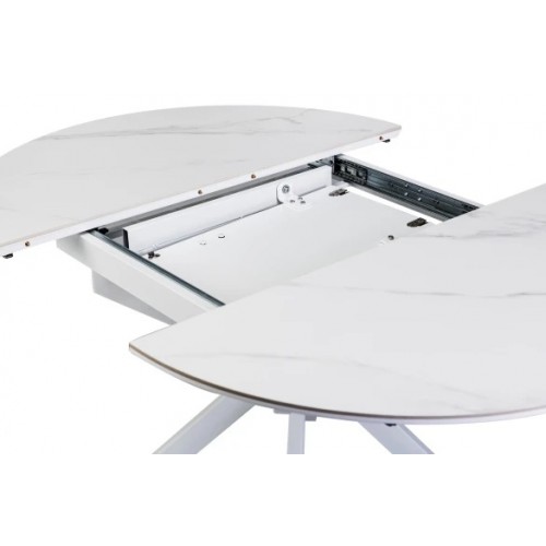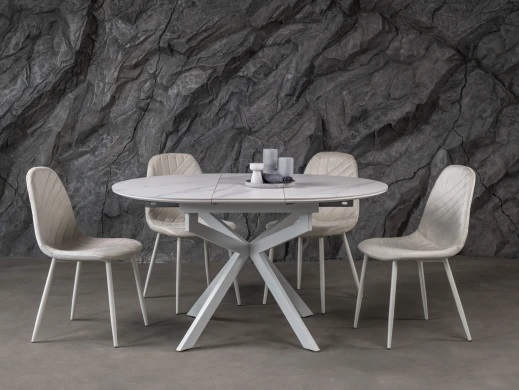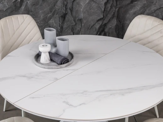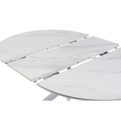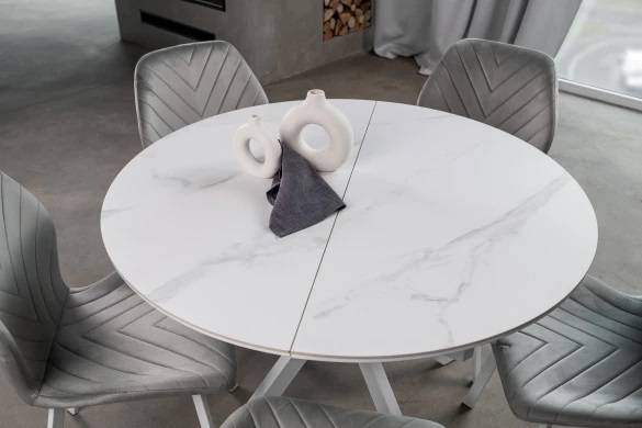 Керамічний стіл Офелія TML-1250 у кольорі калакатта крістал поєднує елегантний дизайн і практичність. Стільниця виконана з матової кераміки в комбінації з МДФ, що забезпечує її довговічність і стійкість до пошкоджень. Діаметр столу у складеному вигляді становить 105 см, а у розкладеному – 138 см, завдяки механізму розкладки книжка-автомат, який дозволяє легко змінювати розмір.
