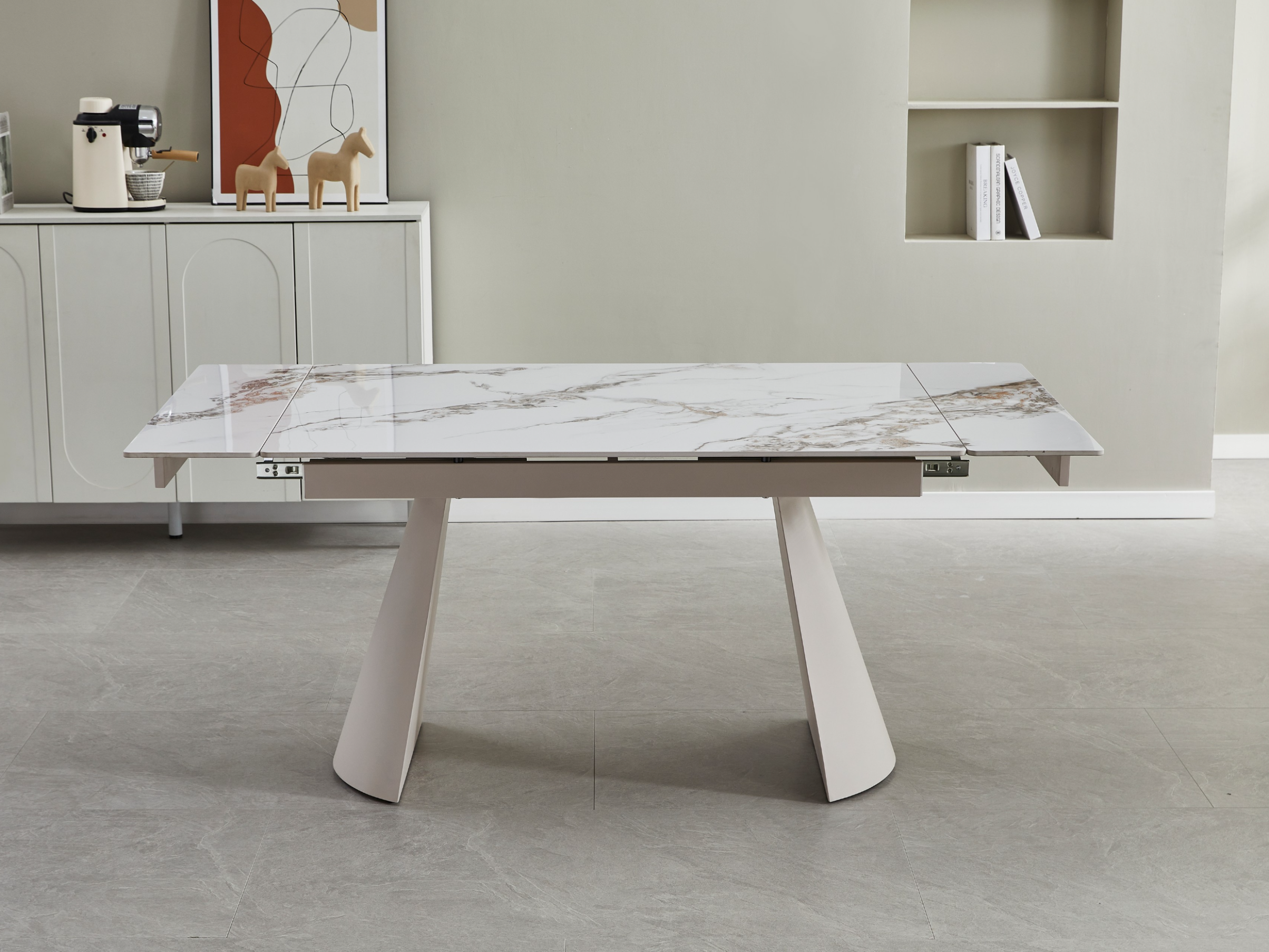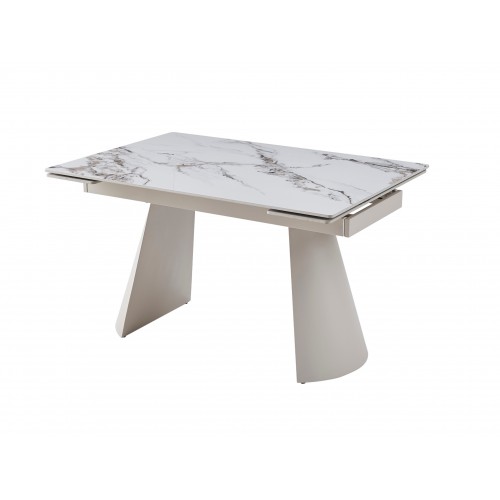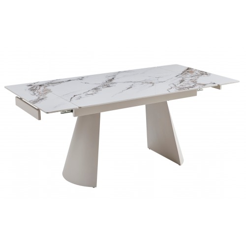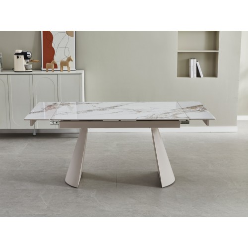 Металева основа у кольорі капучино додає конструкції солідності, але не перевантажує її — навпаки, створює елегантний баланс між масивністю та повітряністю. Завдяки продуманому боковому механізму стіл легко трансформується, збільшуючись із 130 до 180 см. Цей рух — плавний і надійний, наче добре відпрацьований жест, — дозволяє за лічені секунди підготувати простір до зустрічі гостей.