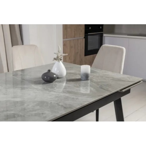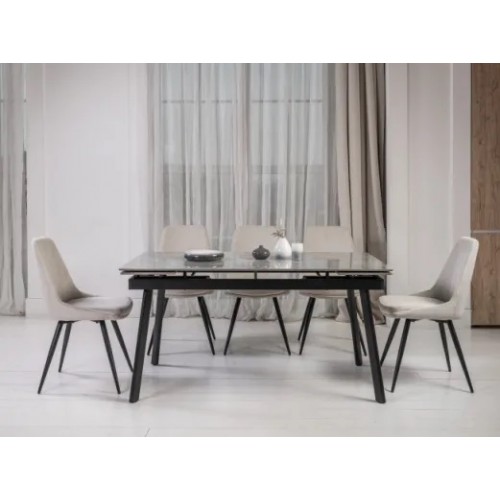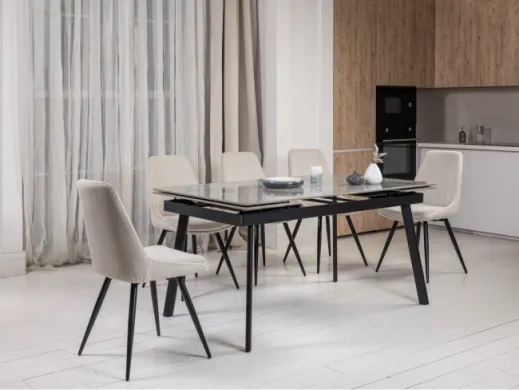 Завдяки боковому механізму розкладання стіл легко трансформується з 150 до 210 см, забезпечуючи комфортне розміщення гостей як у повсякденному житті, так і під час святкових подій. Глянцева керамічна стільниця стійка до високих температур, а міцна металева конструкція гарантує надійність і довговічність.
