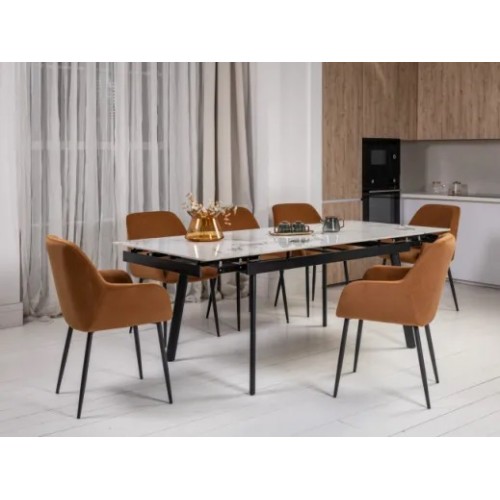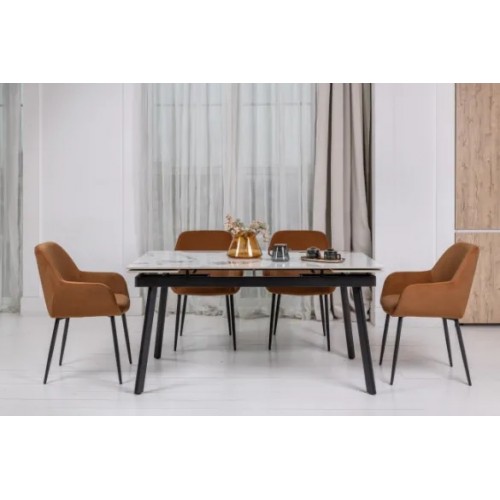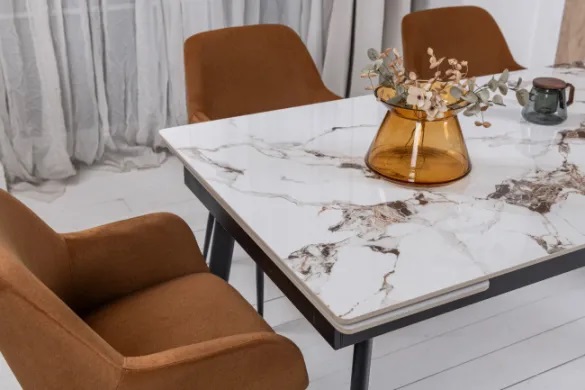 Керамічний стіл TM-98 панда вайт + чорний — це справжній арт-об’єкт у вашій оселі. Його стільниця з глянцевої кераміки в ефектному відтінку панда вайт нагадує структуру натурального мармуру з контрастними прожилками, створюючи унікальний візуальний акцент. У поєднанні з чорною металевою основою стіл виглядає стильно та сучасно, додаючи інтер’єру характеру й динаміки.