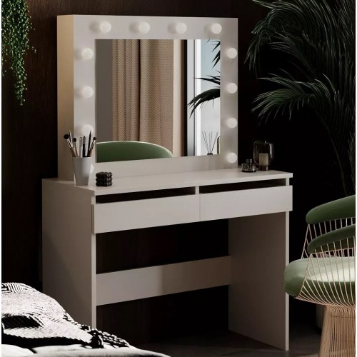Центральним елементом цього столика є дзеркало розміром 490×604 мм, обладнане 12 патронами для лампочок. Це забезпечує рівномірне та яскраве освітлення, необхідне для точного нанесення макіяжу або догляду за собою. Лампочки нейтрального кольору, які йдуть у комплекті, можна замінити на більш холодні або теплі, залежно від ваших уподобань.