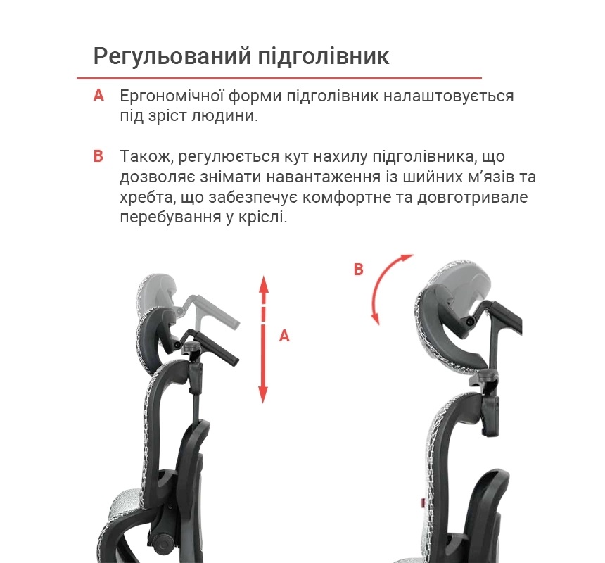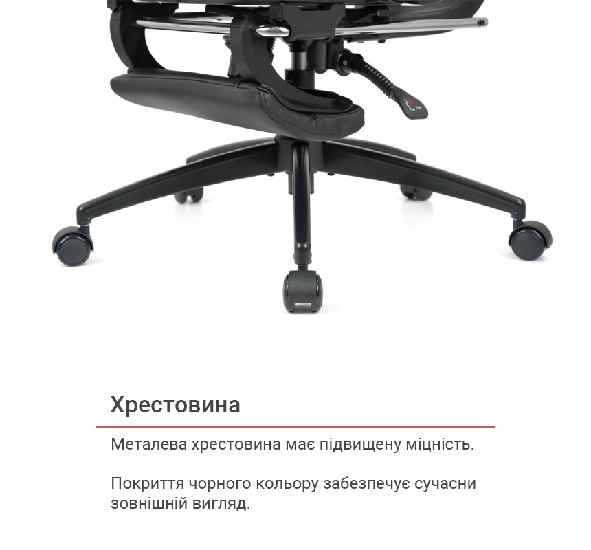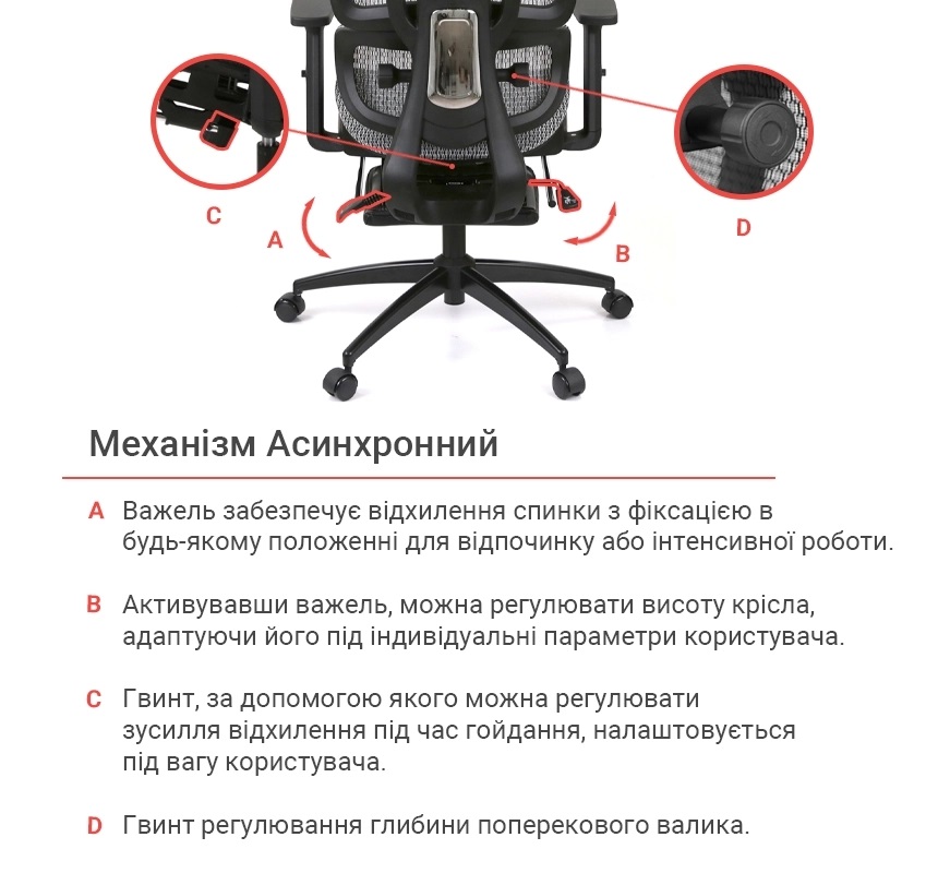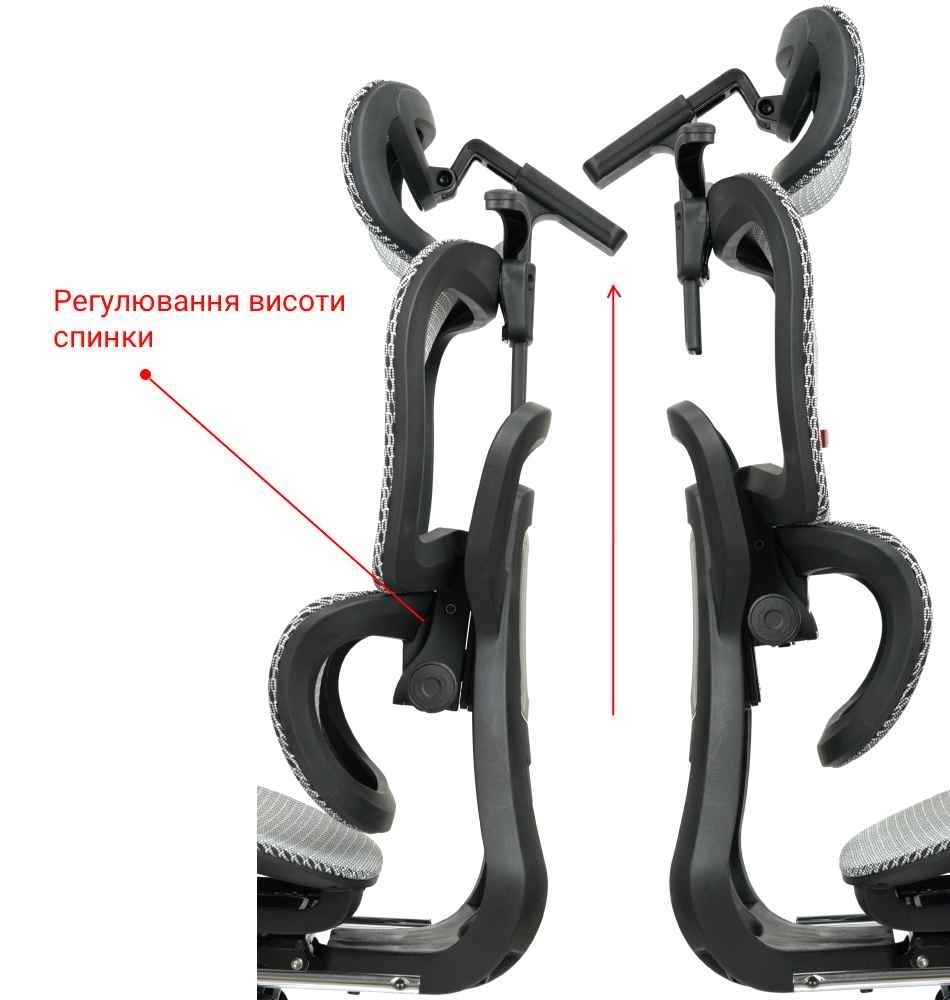 Регулювання Висота сидіння Жорсткість качання Нахил спинки Висота спинки Регулювання підлокітників Регулювання підголівника