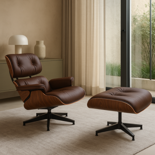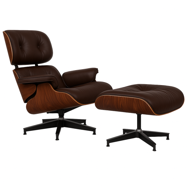 Розкішне крісло з отоманкою Релакс – це втілення архітектурного стилю сучасної епохи, королівський дизайн та максимальний комфорт із високоякісними матеріалами, якістю виготовлення за найвищими стандартами. Сидіння, спинка з підголовником та підлокітники виготовлені з 7 шарів формованої гнутої фанери, шпон колір палісандр або рожеве дерево, а сполучні деталі створюють унікальну форму, матеріал оббивки натуральна шкіра. Подушки сидінь з'єднані за допомогою чорної застібки, яка вшита по зовнішньому краю, для амортизації використовуються гумові шайби. Внутрішня підтримка забезпечується за рахунок вбудованих роликів та спеціальних кілець. Крісло оснащене опорами, що амортизують, що забезпечують максимальний розкішний комфорт, і цей привабливий ефект спонукає вас поринути в відкидне сидіння. Основа – ніжки металеві чорного кольору. Крісло та отоманка широко використовуються у вітальнях та офісах та виділяється поєднанням матеріалів та дизайном. Розмір крісла 87*87*84 см, розмір отоманки 65*54*44 см.