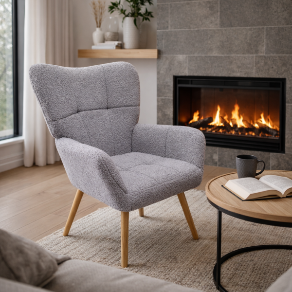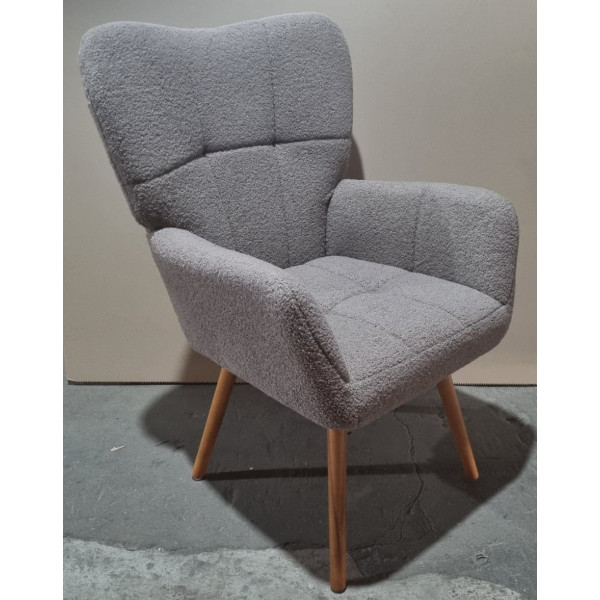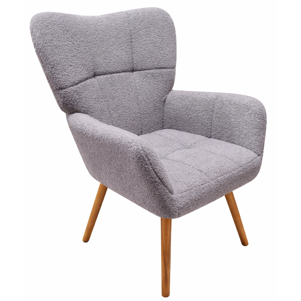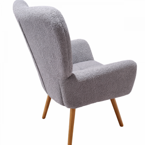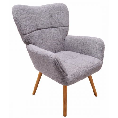 М'яке крісло з високою спинкою, просторе сидіння, основа сидіння виготовлена з фанери, поролон всередині, м'яка тканина букле тедді, зручні підлокітники, дерев'яні ніжки з бука з натуральним відтінком, розмір крісла: ширина сидіння 65 см, глибина сидіння 60 см, висота посадки 52 см, висота крісла 101 см. Кількість у коробці: 1 од.