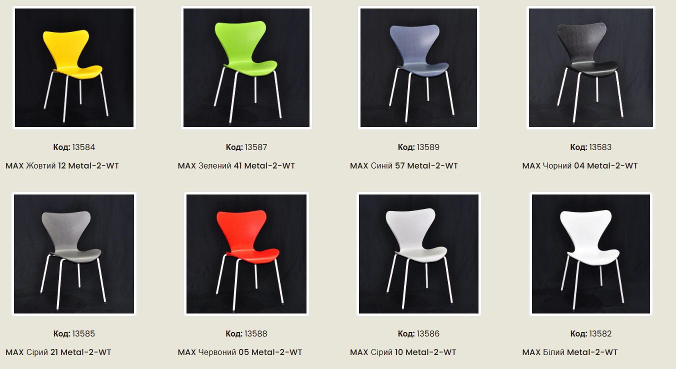 Стілець Max (Макс) - творіння дизайнера Arne Jacobsen з колекції Series 7 - один з найбільш продаваних стільців у світі. Його можна побачити по всьому світу, від музеїв, кафе і ресторанів, до корпоративних залів засідань і конференц-залів. Дуже вдала модель стільця, у якої 3 основні переваги: прекрасний, перевірений багатьма інтер'єрами, дизайн, міцний металевий каркас, на якому встановлене міцне поліпропіленове сидіння, створене з урахуванням усіх вимог ергономіки, з вигином краю сидіння плавно вниз, що унеможливлює тиск на ноги людини, яка сидить, і безпрецедентно низька вартість, можна штабелювати в стопку.