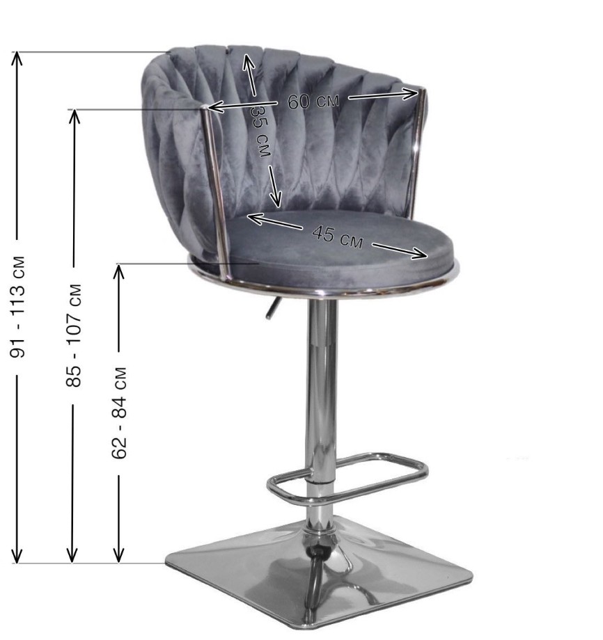 Барний стілець MILA BAR велюрова оббивка, з металевою базою, з підлокітниками , поворотним механізмом та регулюванням висоти за допомогою газового ліфта. М'яка спинка має чудову бічну підтримку спини, а зручне сидіння та підлокітники допоможуть провести тривалий час з комфортом, сидячи у кріслі. Дизайн легко впишеться в інтер'єр Вашого будинку, апартаментів, офісу, салону краси, перукарні, ресторану, готелю.