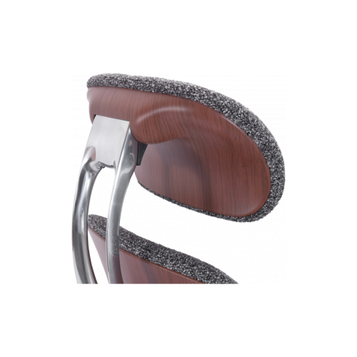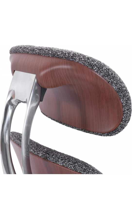 Модель представлена в тканинній оббивці в сірому відтінку з декоративними дерев'яними вставками в теплому натуральному тоні. Металева основа має матове покриття. Дерево виступає у ролі декоративної ноти, яка візуально пом'якшує строгий стиль та додає статусності.