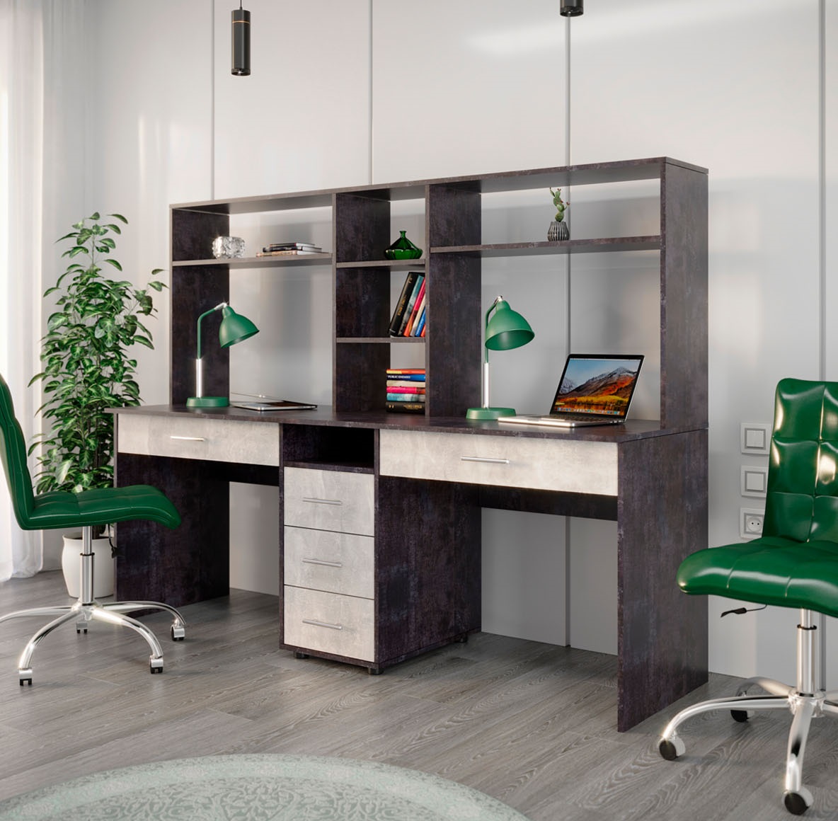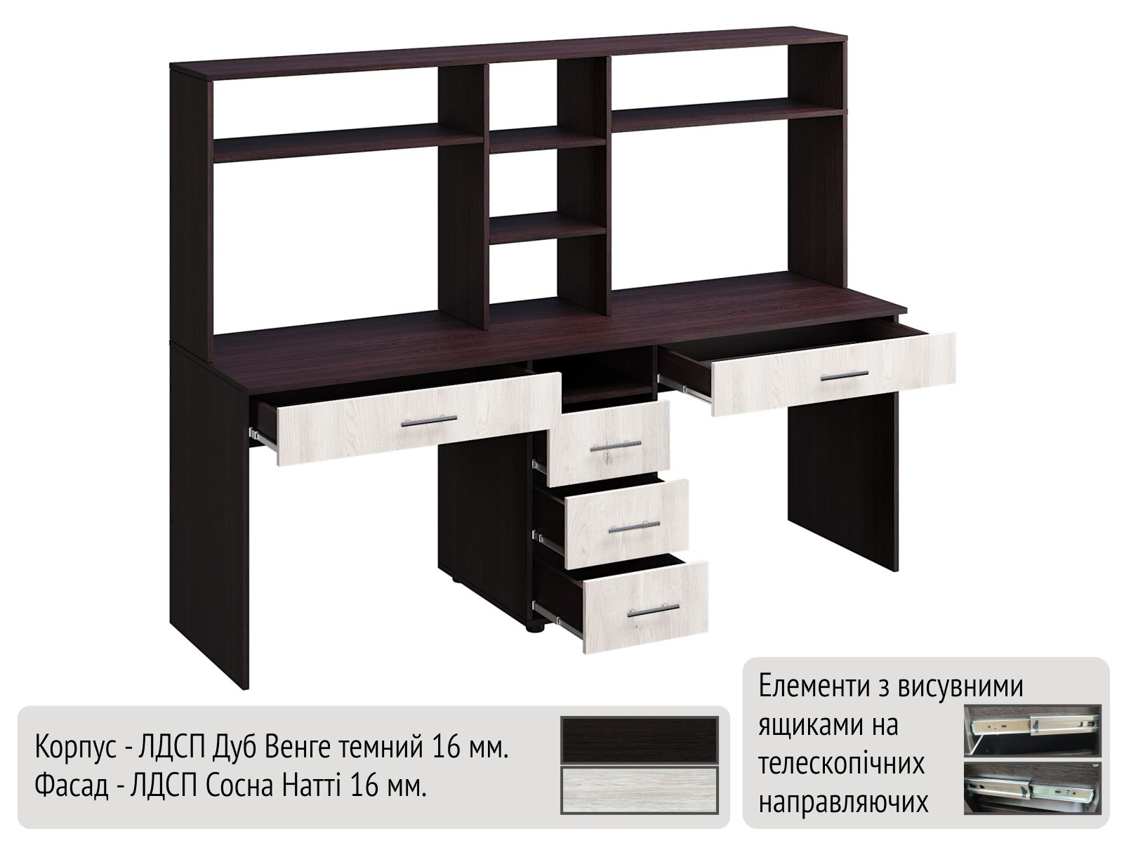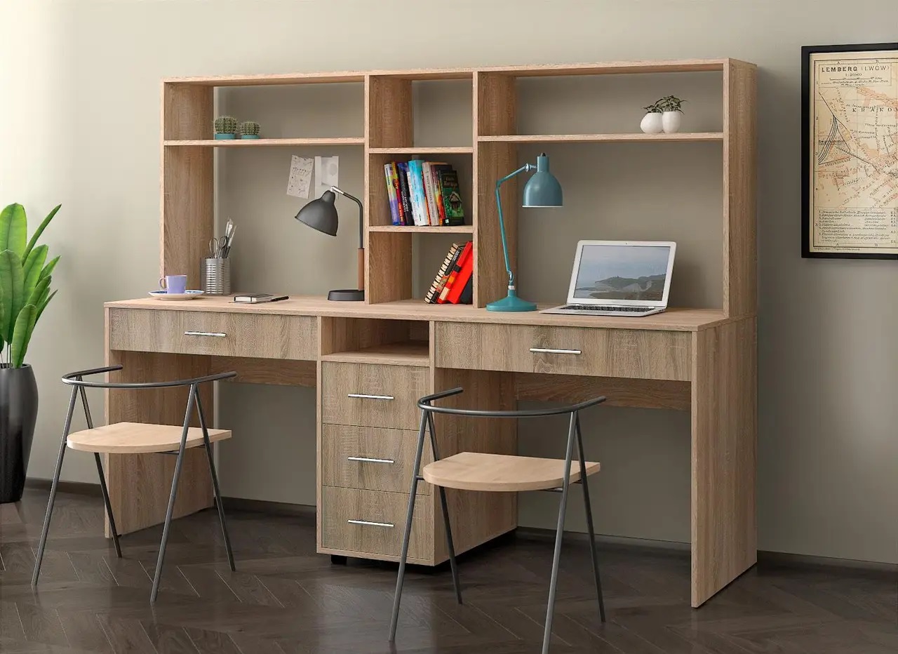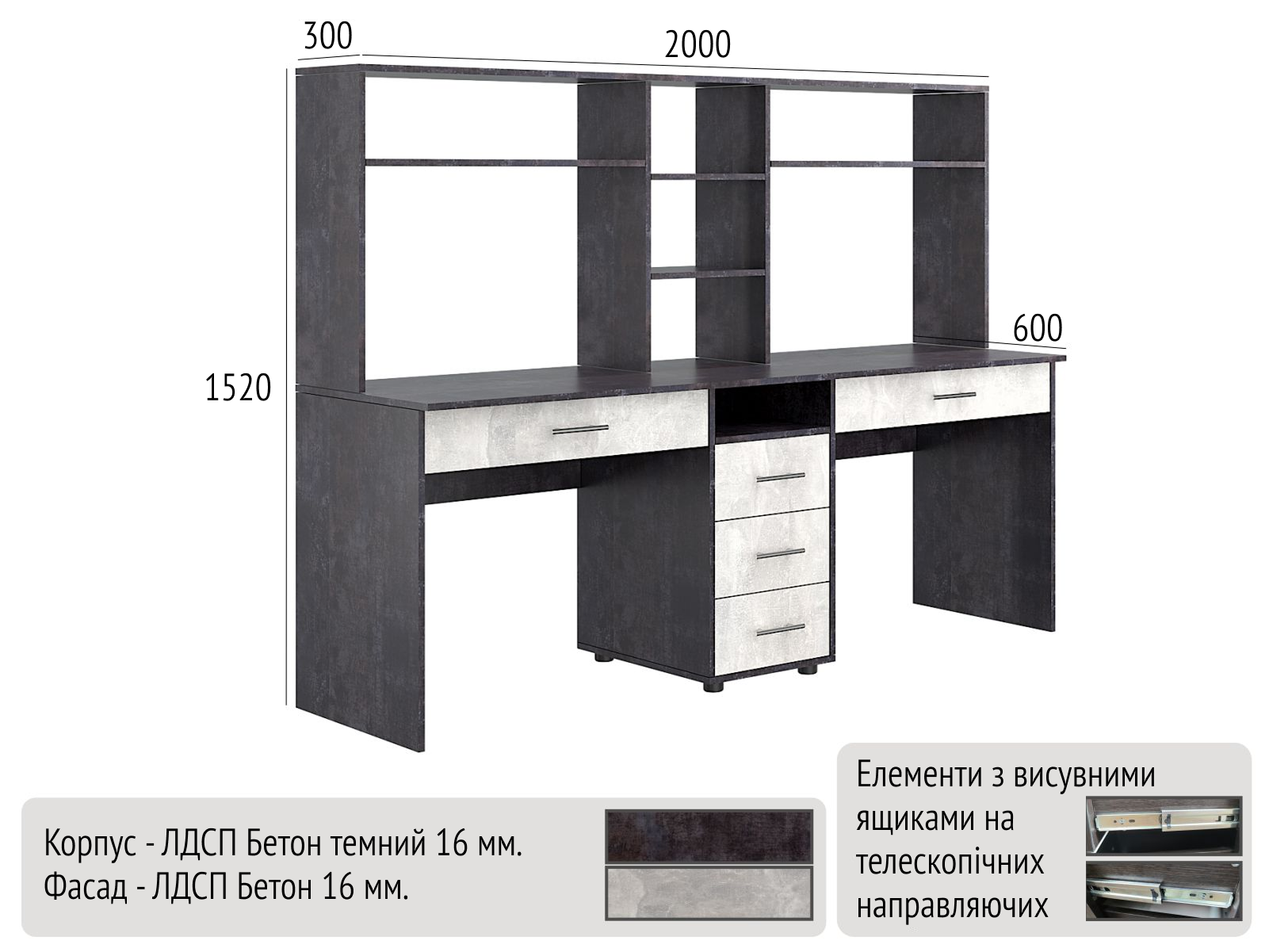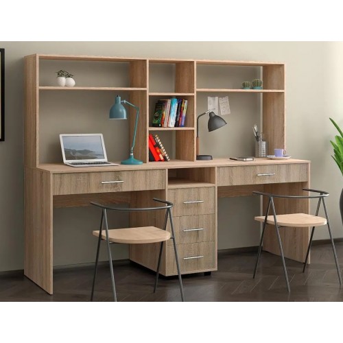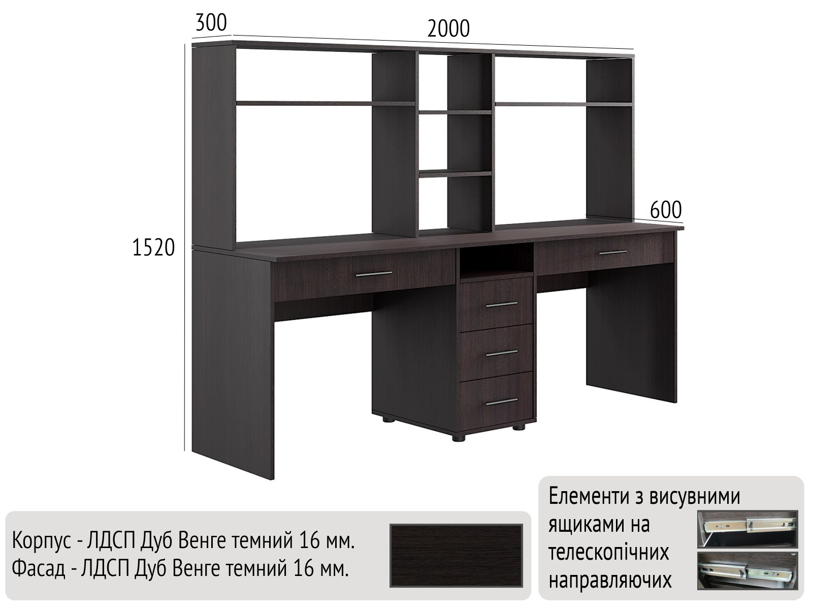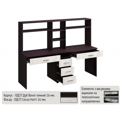 Стіл КС-02 – це просторе та зручне рішення для організації двох робочих місць в одному інтер’єрі. Завдяки функціональній конструкції з надбудовою та висувними ящиками, цей стіл стане ідеальним вибором для дому, офісу або навчального кабінету.