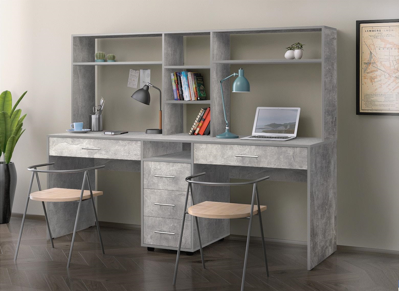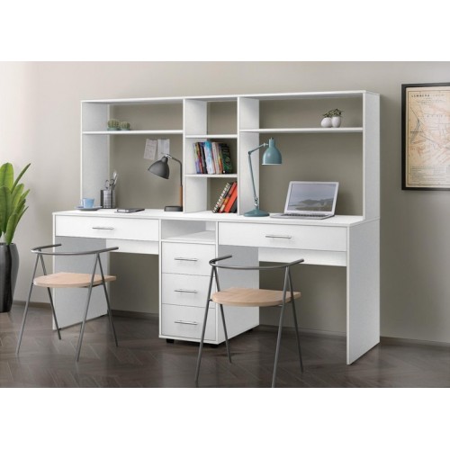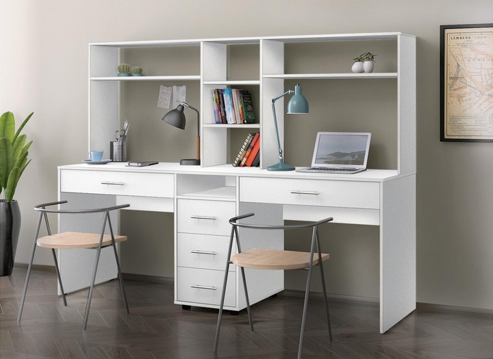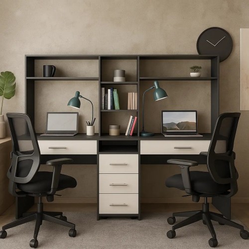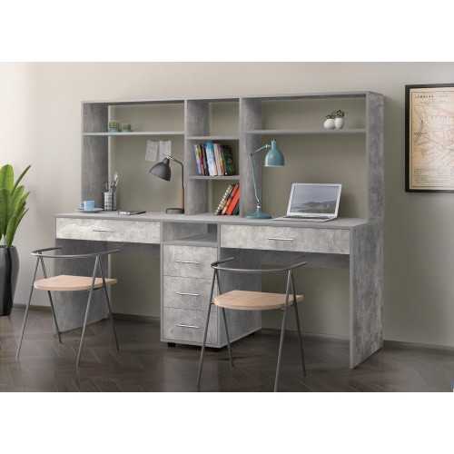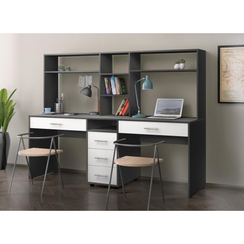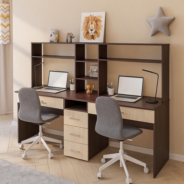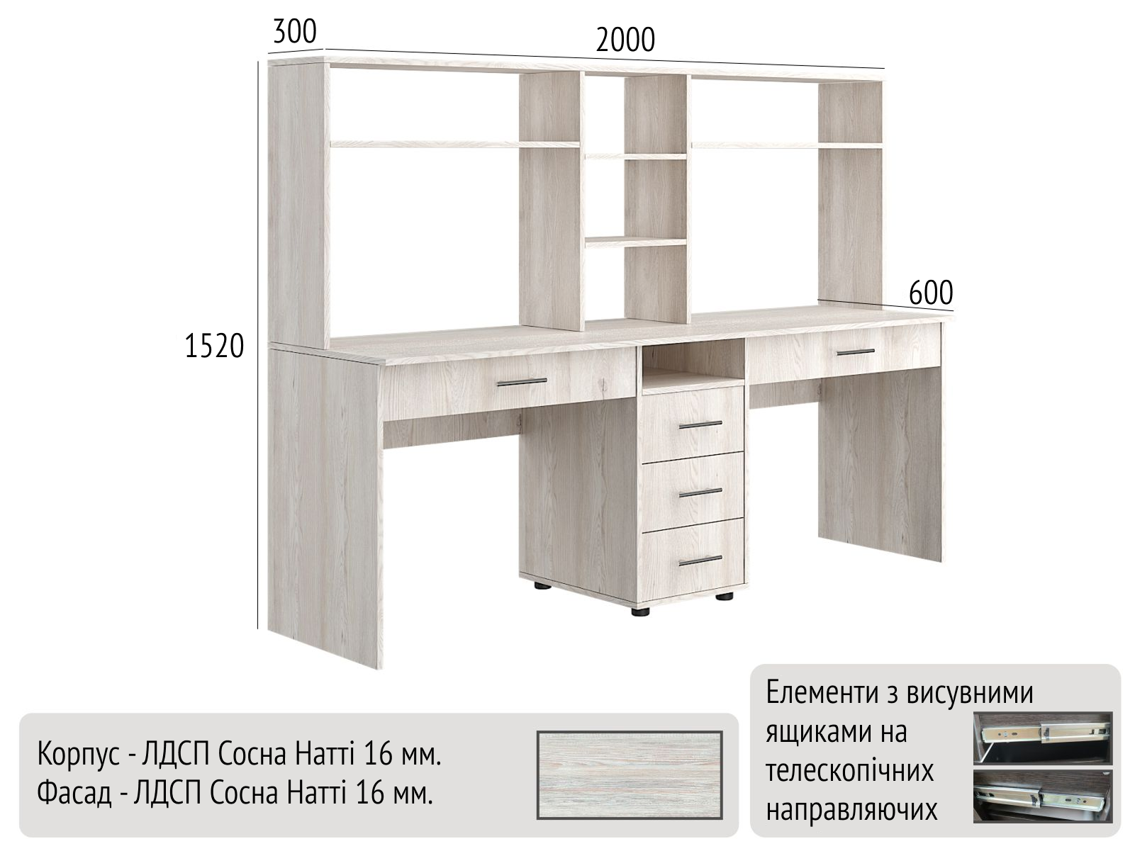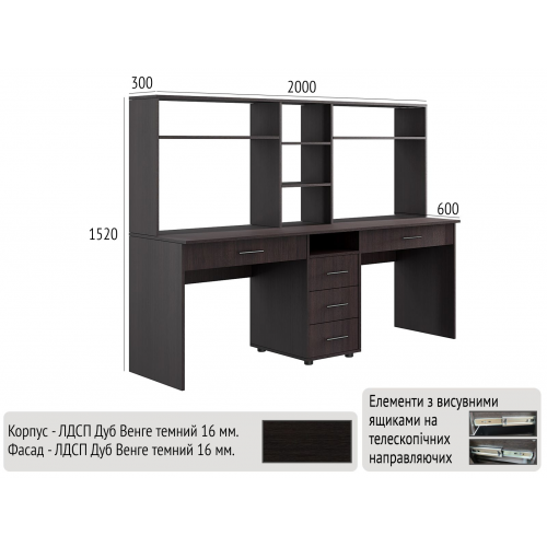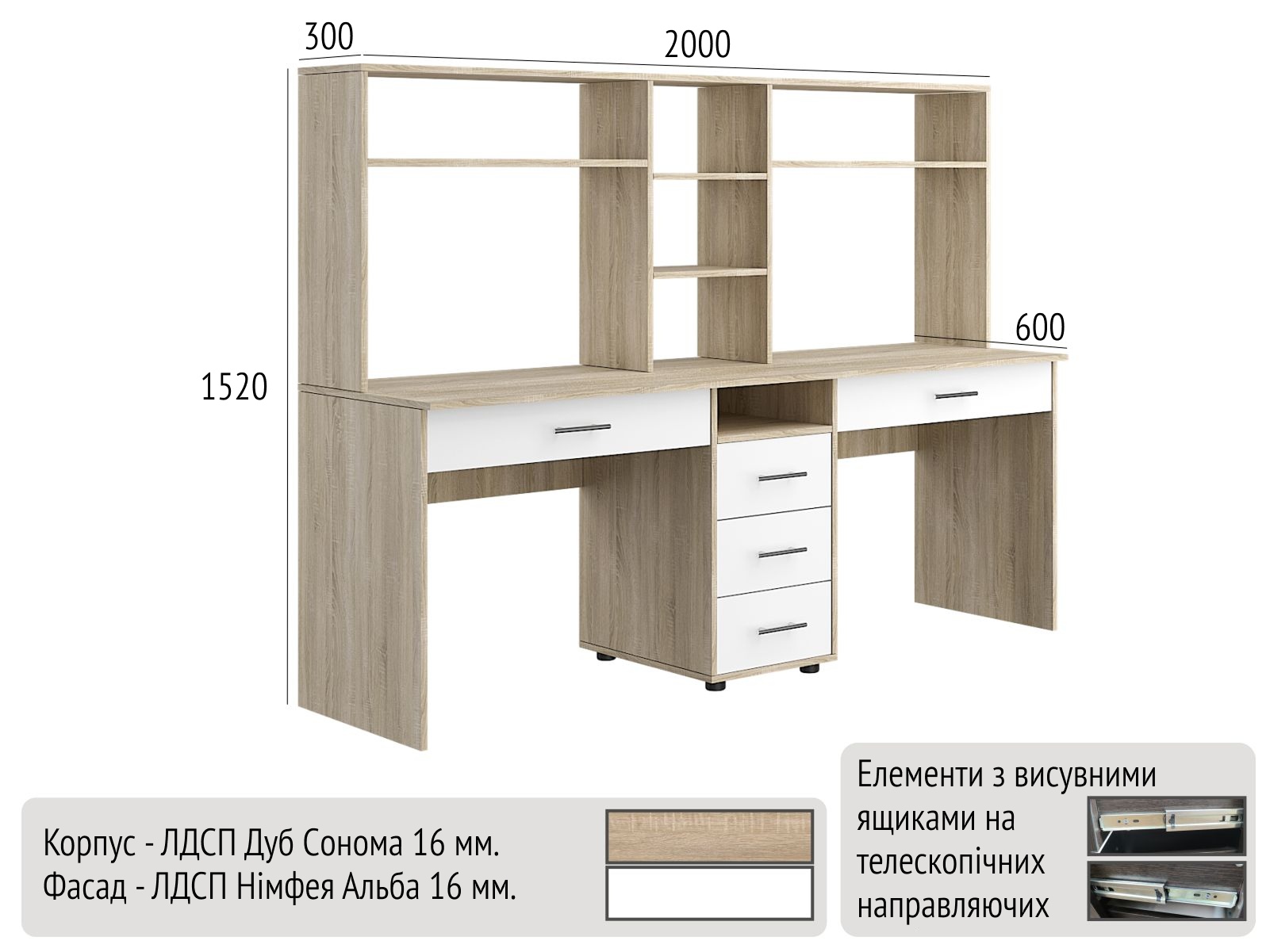 Стіл КС-02 – це просторе та зручне рішення для організації двох робочих місць в одному інтер’єрі. Завдяки функціональній конструкції з надбудовою та висувними ящиками, цей стіл стане ідеальним вибором для дому, офісу або навчального кабінету.