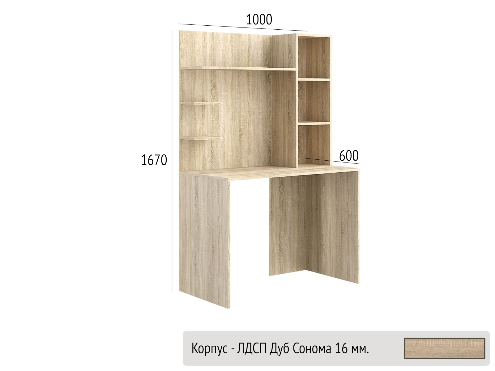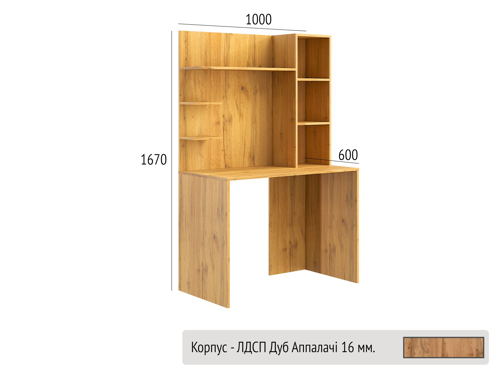 Корпус виготовлений з ЛДСП 16мм та доступний до замовлення у всіх декорах ЛДСП складської програми.