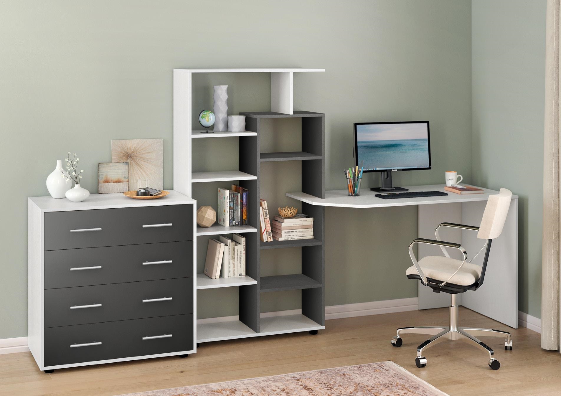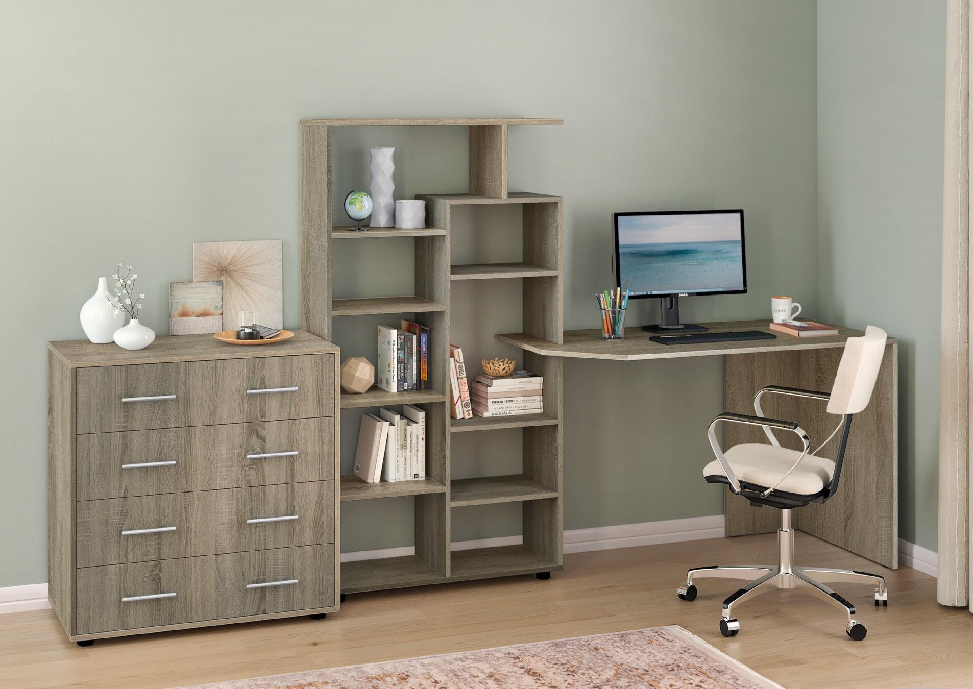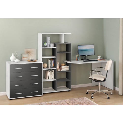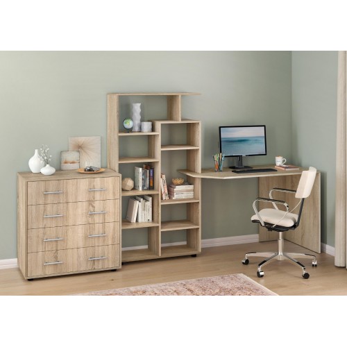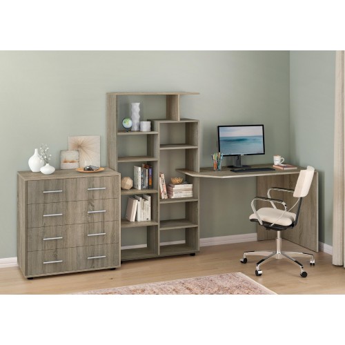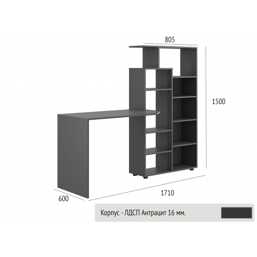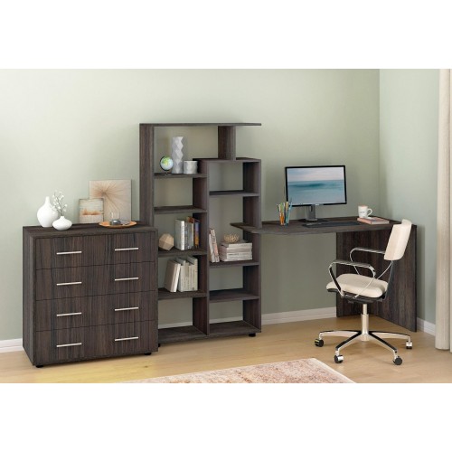 Стіл КС-08 — це універсальне рішення для тих, хто шукає зручне, компактне та стильне робоче місце. Завдяки вбудованому стелажу з численними відкритими полицями, він поєднує в собі функціональність письмового стола та системи зберігання.
