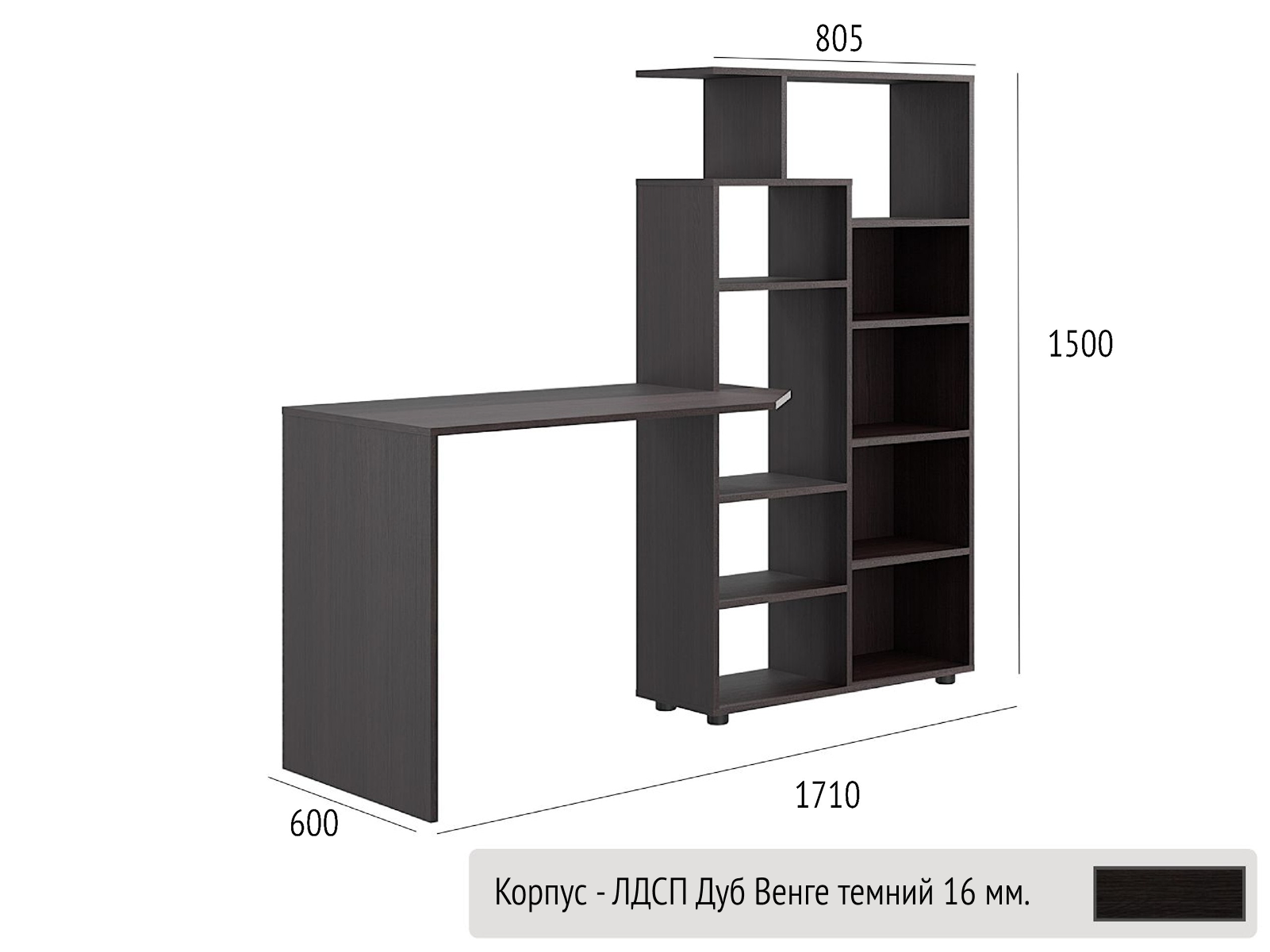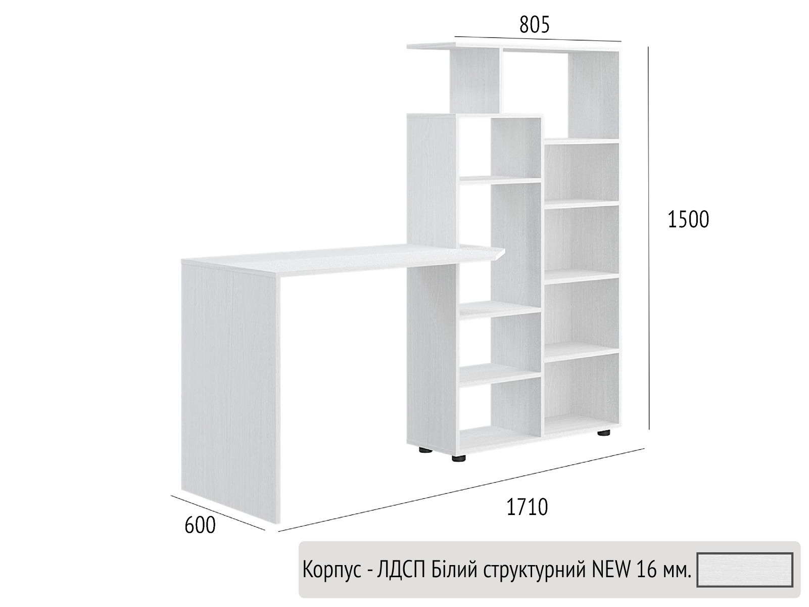 Корпус виготовлений з ЛДСП 16мм та доступний до замовлення у всіх декорах ЛДСП складської програми.