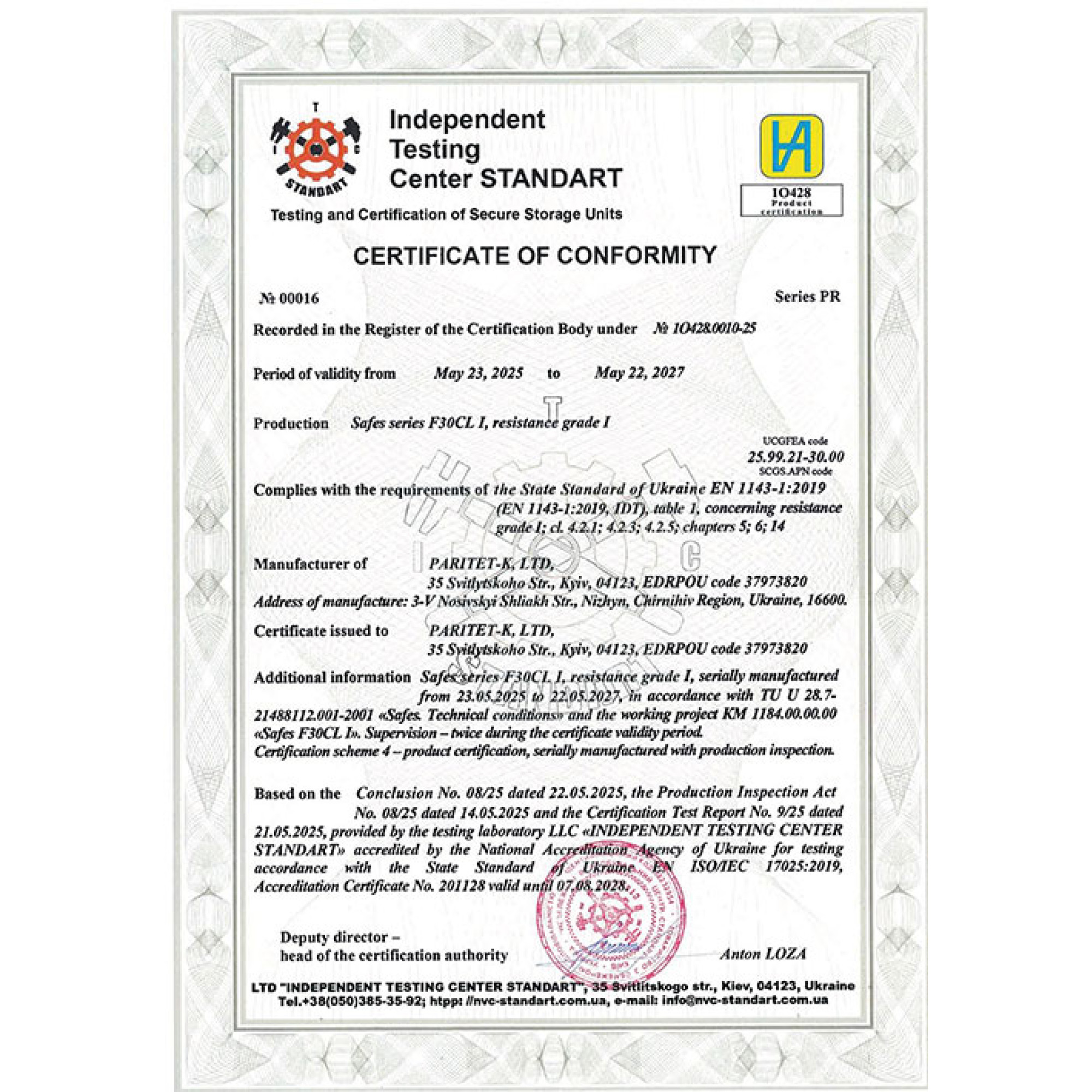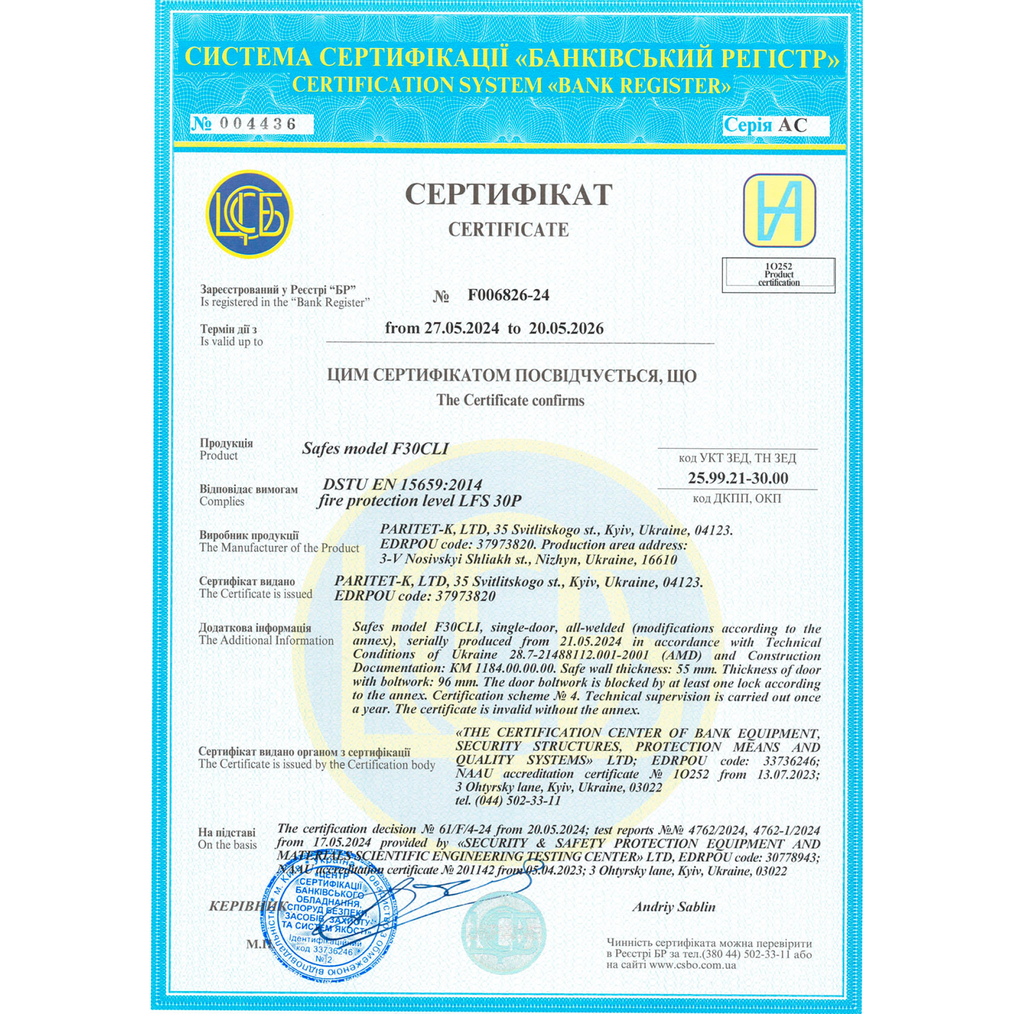 Серія F. 30CLI являє собою унікальну лінійку сертифікованої продукції здатну одночасно захищати цінні речі від зламу (перший клас) і дії вогню (клас LFS 30P). Корпус і двері сейфа заповнюються огневзломостойким бетоном товщиною 55 мм, а вбудована ригельна система відрізняється тристороннім захистом, кодовим сертифікованим сейфовим замком M-LOCKS чи SmartLock або ключовим STUV і німецької термострічкою BASF.