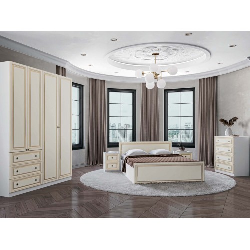 Приліжкова тумба з двома шухлядами забезпечує порядок біля ліжка, а саме двоспальне ліжко — це центр затишної спальної зони. Всі елементи виконані в єдиному стилі, що дозволяє легко створити гармонійний інтер’єр.