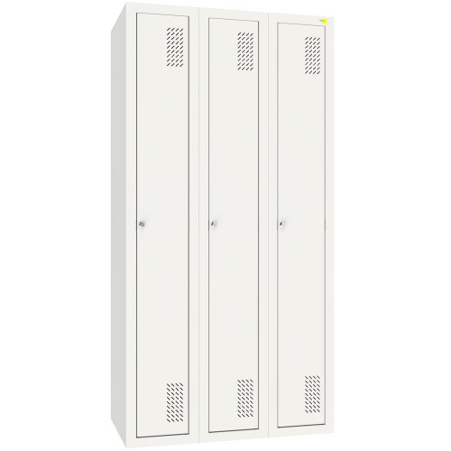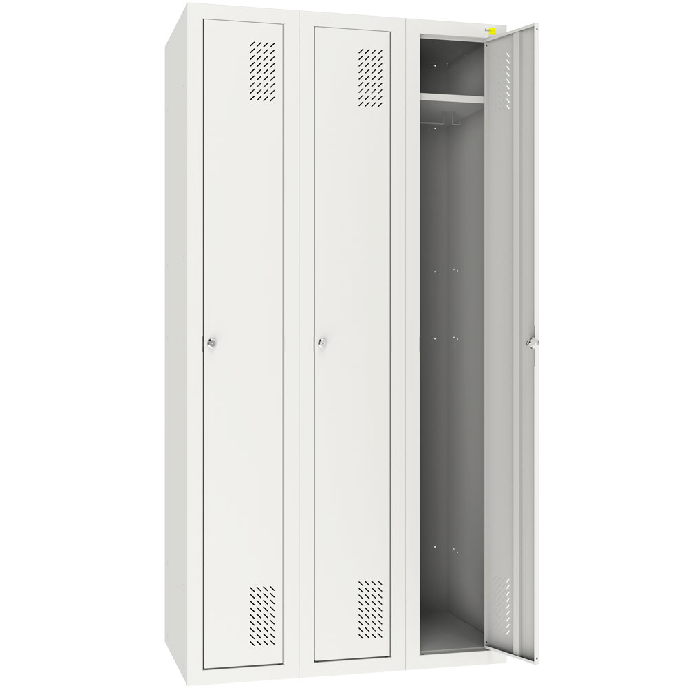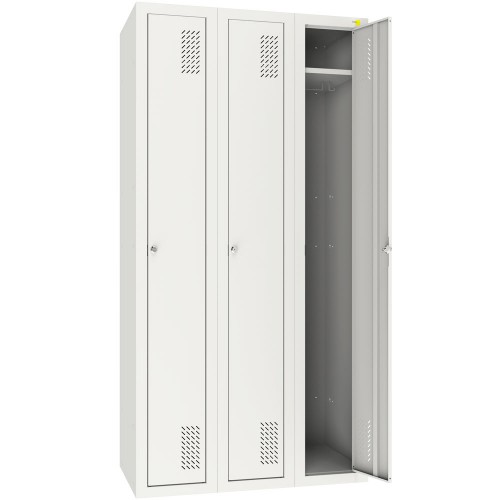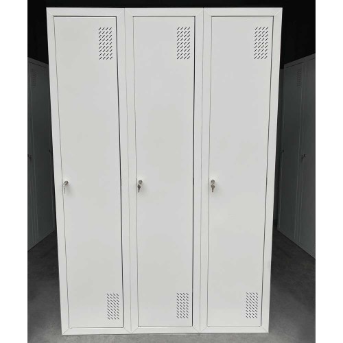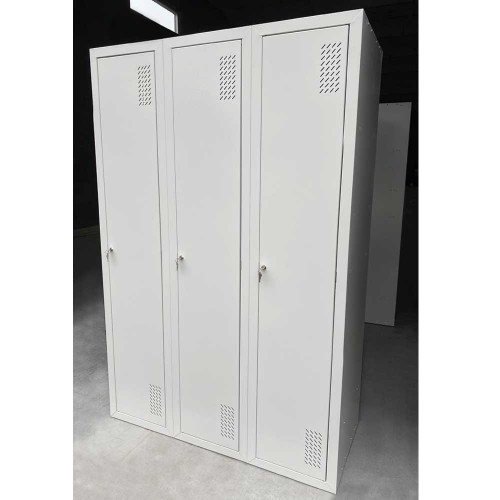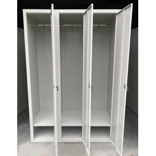 Металева шафа для одягу – надійне і практичне рішення для зберігання одягу і особистих речей. Шафа складається з міцного металевого каркасу, виконаного з якісної сталі, що забезпечує стійкість і довговічність конструкції. Дверцята шафи також виготовлені з металу, забезпечуючи додаткову стійкість та захист від вандалізму. Металеві шафи вкриті спеціалізованою порошковою фарбою світло-сірого кольору (RAL 7035). Шафа має достатньо великий внутрішній простір, де можна зручно розмістити одяг, взуття та аксесуари. Дверцята оснащені замком, що забезпечує безпеку зберігання ваших речей.