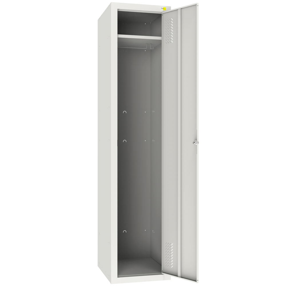 Металева шафа для одягу – надійне і практичне рішення для зберігання одягу і особистих речей. Шафа складається з міцного металевого каркасу, виконаного з якісної сталі, що забезпечує стійкість і довговічність конструкції. Дверцята шафи також виготовлені з металу, забезпечуючи додаткову стійкість та захист від вандалізму. Металеві шафи вкриті спеціалізованою порошковою фарбою світло-сірого кольору (RAL 7035). Шафа має достатньо великий внутрішній простір, де можна зручно розмістити одяг, взуття та аксесуари. Дверцята оснащені замком, що забезпечує безпеку зберігання ваших речей.