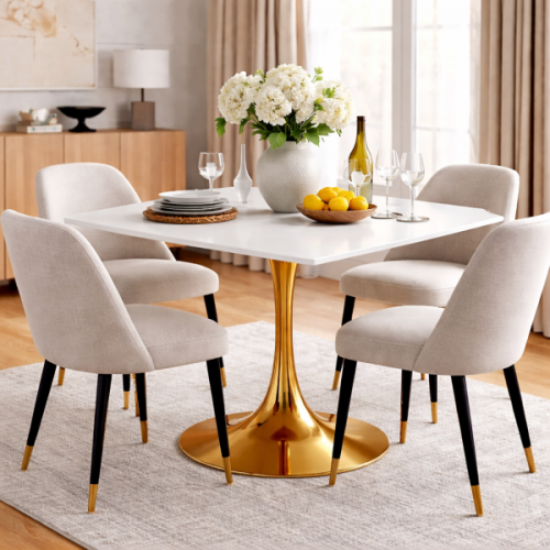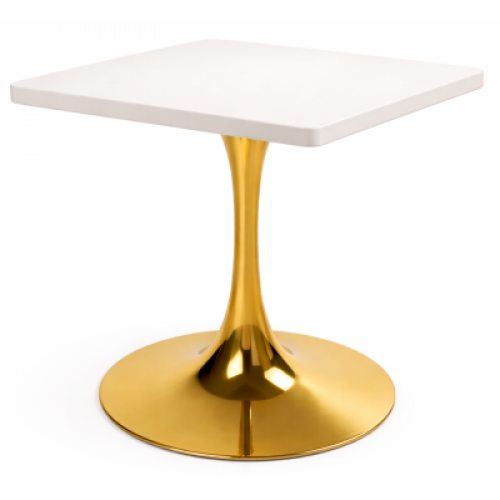 Стіл обідній квадратний, стільниця з матеріалу HPL, колір білий, розмір 80*80 см, опора металева золотого кольору, діаметр внизу 50 см, квадратне кріплення 29 на 29 см вгорі, загальна висота столу 73 см. Стільниця універсальна і не має отворів під цю опору, для встановлення необхідно намітити місця для кріплення та прикрутити опір фурнітурою, яка йде в комплекті! Сучасний дизайн столу з плавними контурами прикрасить кухню, їдальню, терасу або сучасне кафе.