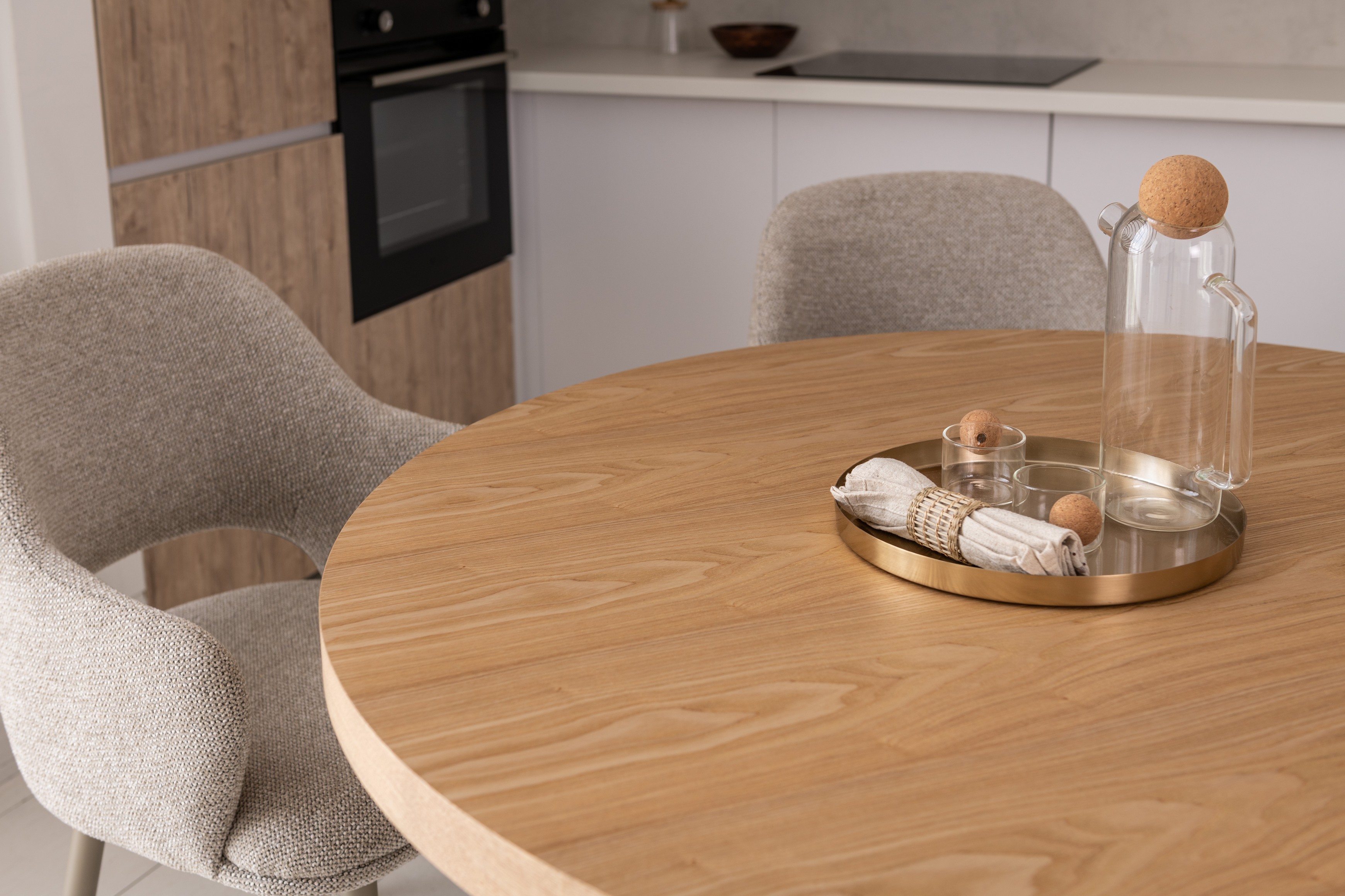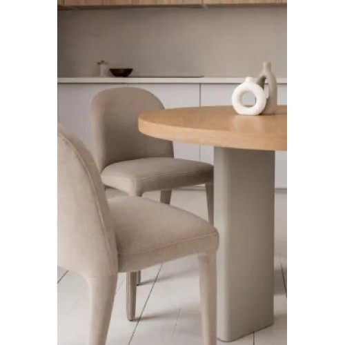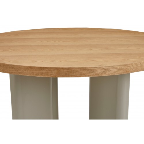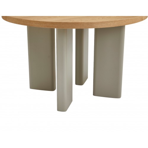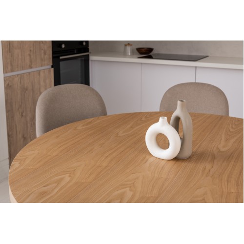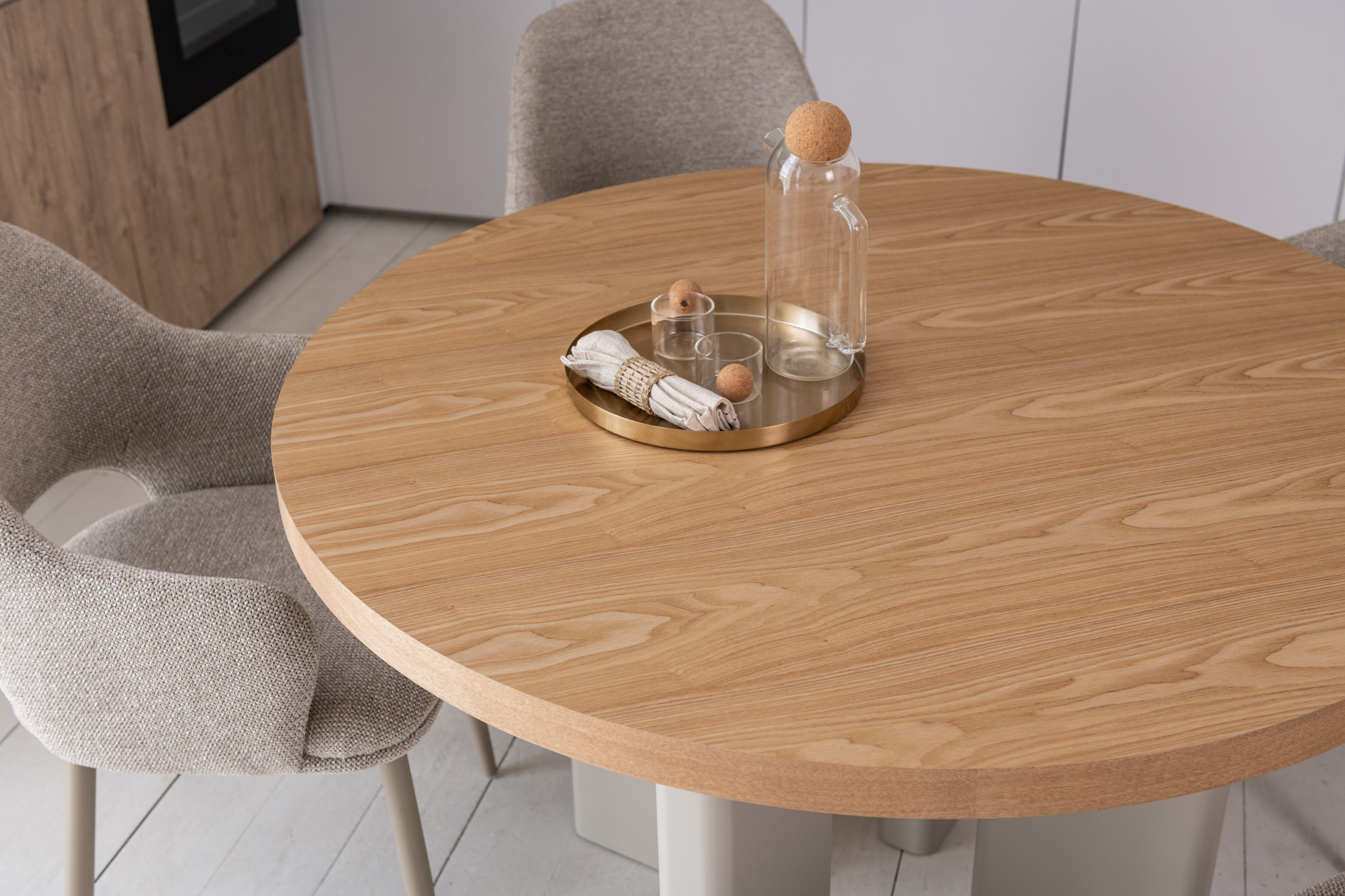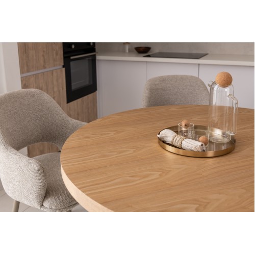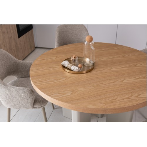 Кругла стільниця діаметром 120 см виготовлена зі шпонованого МДФ у відтінку “ясень”, що додає виробу природного шарму та тепла.