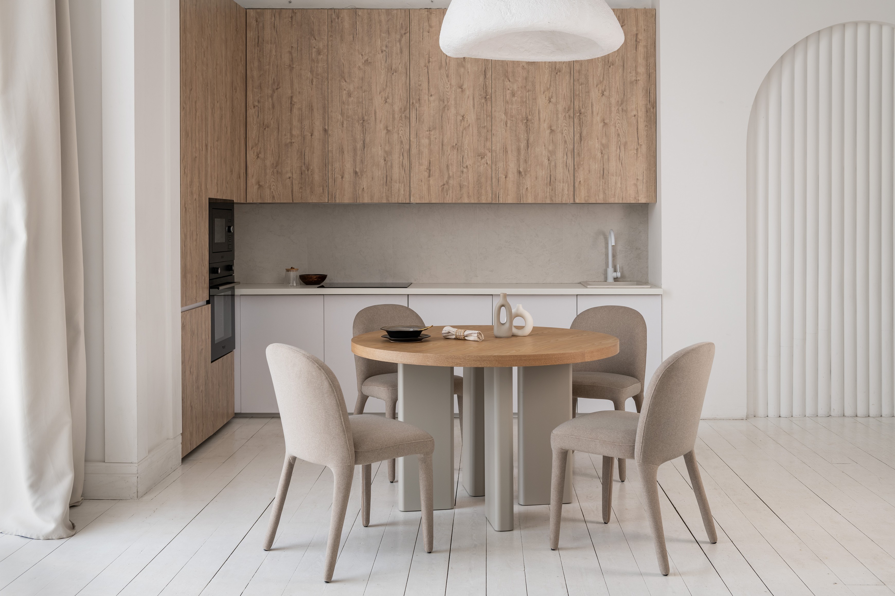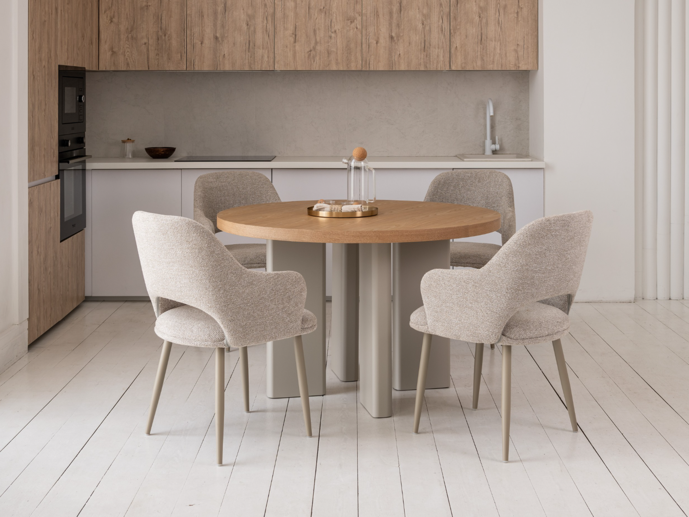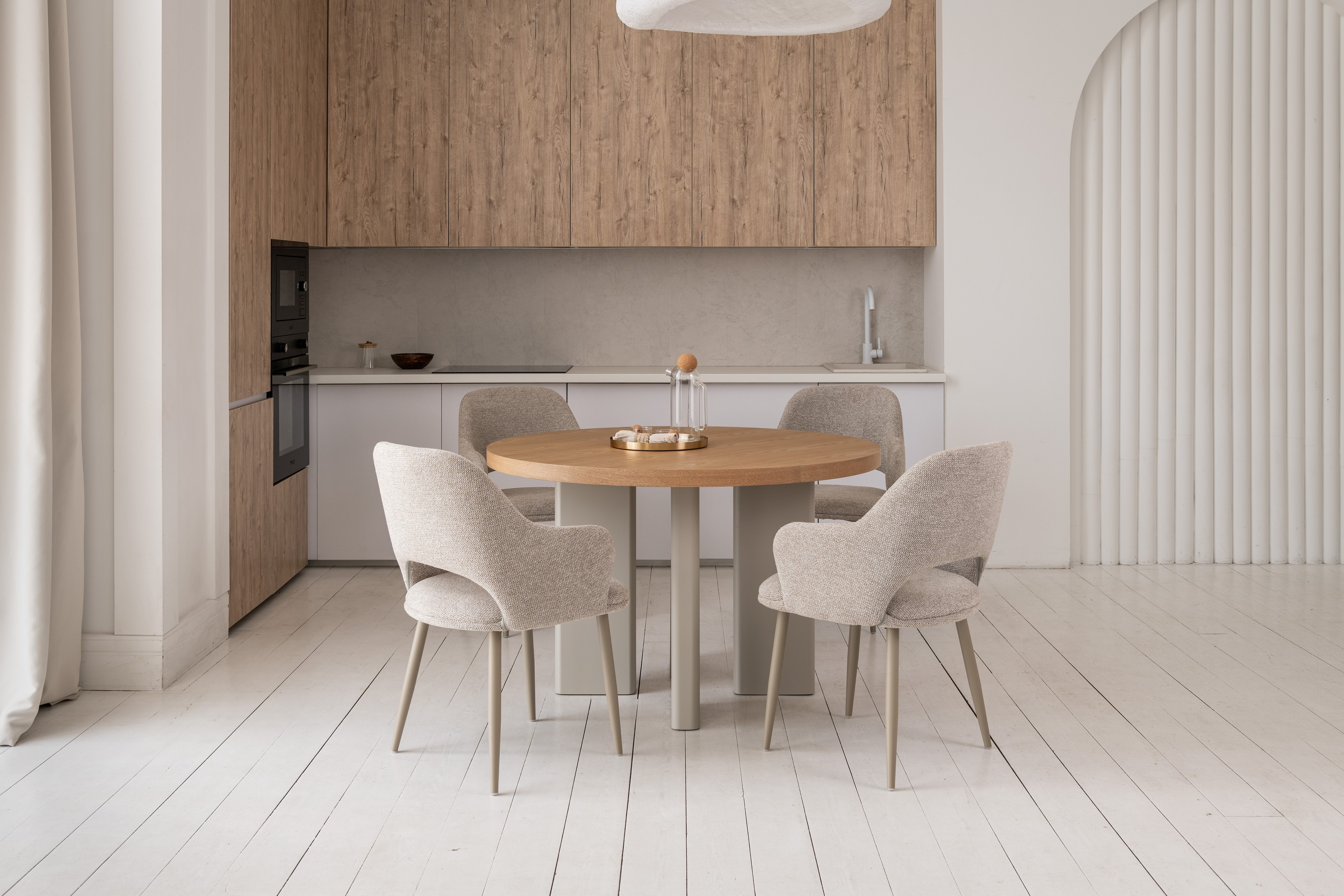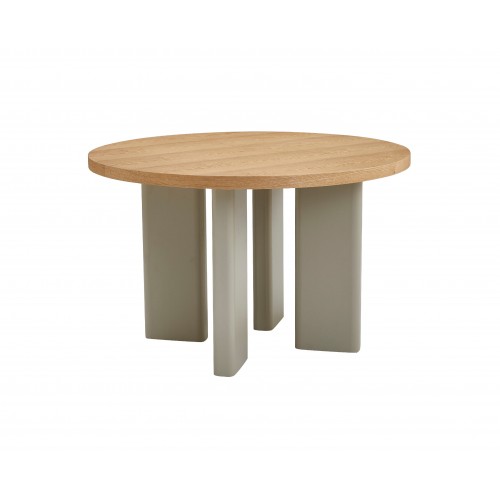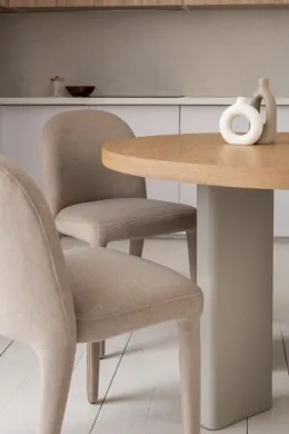Кругла стільниця діаметром 120 см виготовлена зі шпонованого МДФ у відтінку “ясень”, що додає виробу природного шарму та тепла.