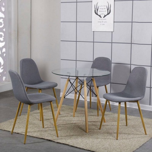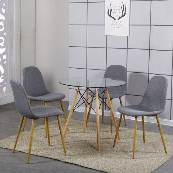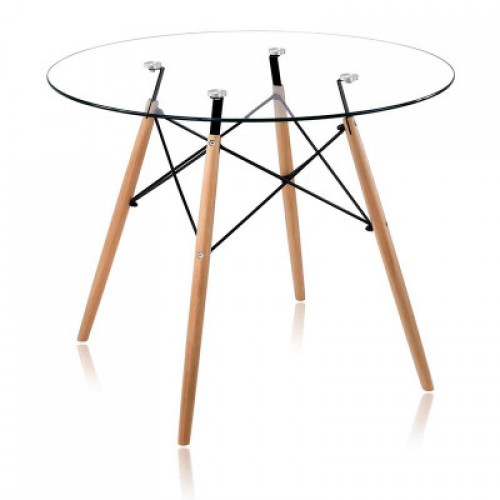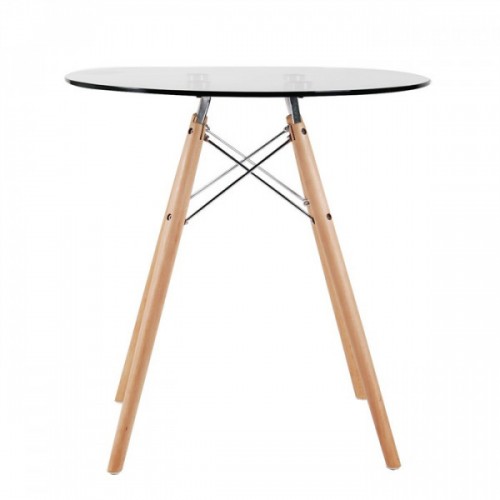 Скляний стіл зі стільницею, виготовленою із загартованого скла товщиною 10 мм, форма стільниці кругла, колір скла прозорий, ніжки виготовлені з дерева бук, металеві з'єднання між ніжками, які роблять всю конструкцію стійкою та міцною, на ніжках встановлені пластикові заглушки для запобігання появ подряпин на поверхні підлоги, розмір столу: висота 73 см, діаметр стільниці 80 см.