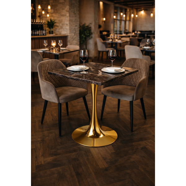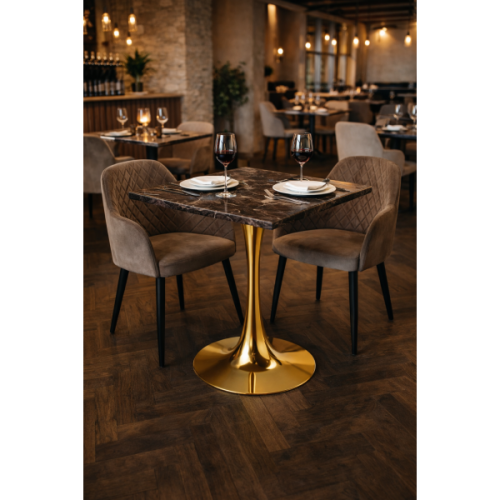 Сучасний, стильний та практичний обідній стіл від Група СДМ — ідеальне рішення для кафе, барів, ресторанів, літніх майданчиків та домашнього використання. Стільниця виготовлена з високоякісного матеріалу верзаліт, що поєднує привабливий дизайн і надзвичайну стійкість до вологи, температурних коливань та механічних пошкоджень. Стійка металева опора забезпечує надійність і довговічність. Стільниця універсальна — не має попередньо зроблених отворів, що дозволяє встановити опору у зручному положенні, простий монтаж — необхідно лише намітити місця кріплення та прикрутити опору фурнітурою, яка входить у комплект. Підходить як для використання в приміщенні, так і на відкритих терасах. Квадратний стіл від Група СДМ — це надійність, стиль і комфорт у кожній деталі. Замовляйте прямо зараз і створіть зручний простір для відпочинку чи бізнесу! Розмір 70*70 см, опора металева золотого кольору, діаметр унизу 50 см, квадратне кріплення 29 см на 29 см вгорі, загальна висота столу 73 см.