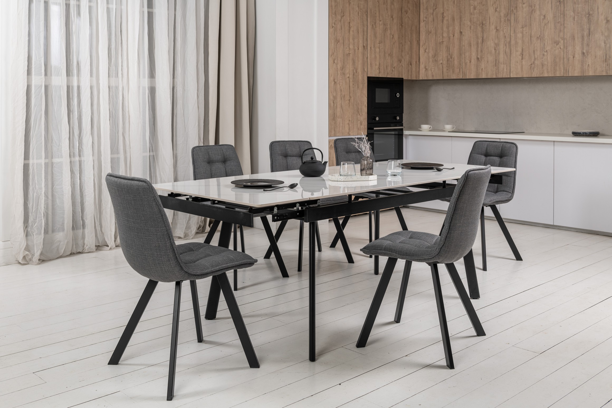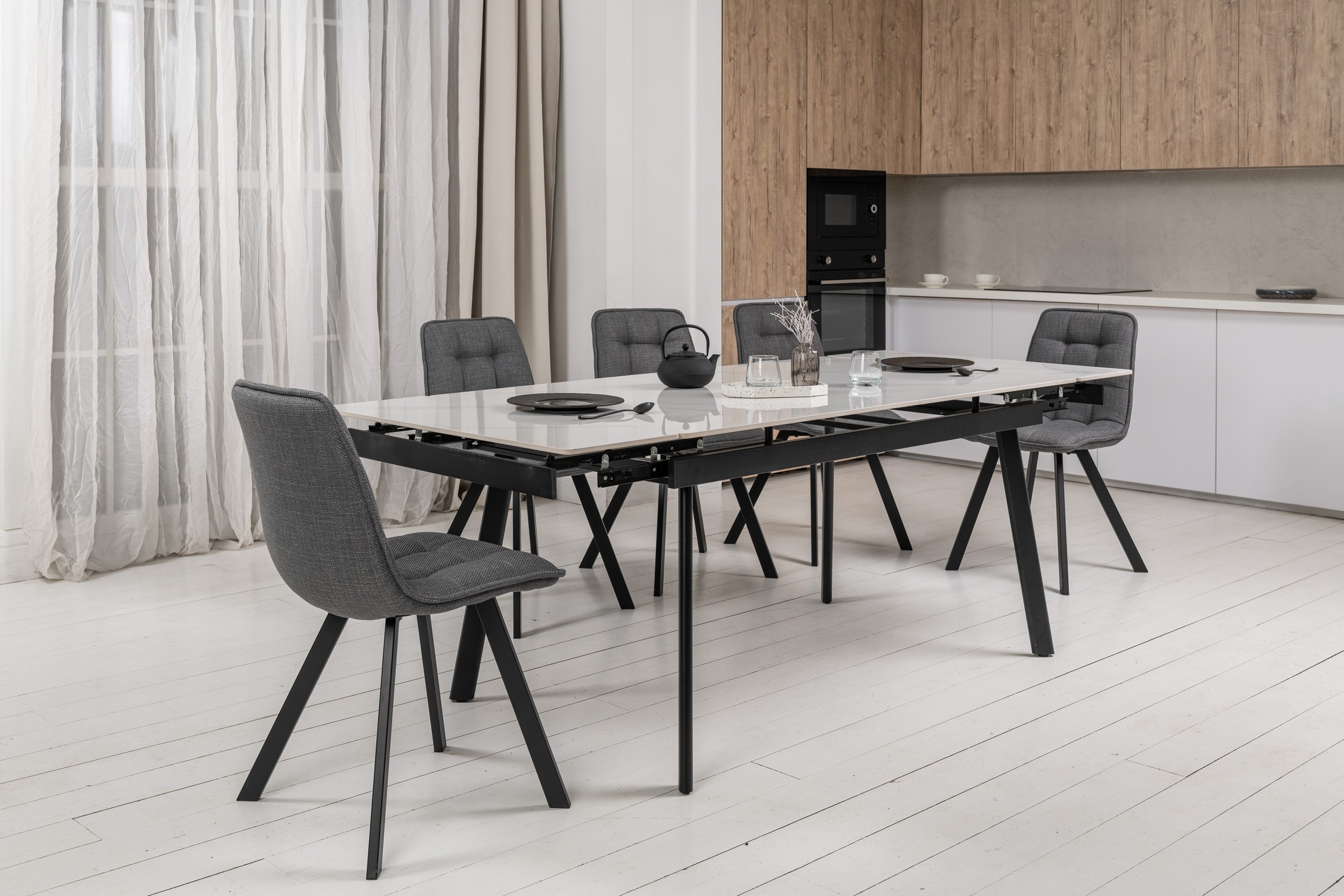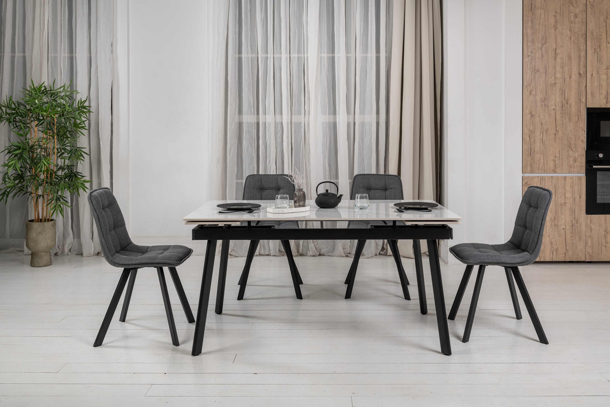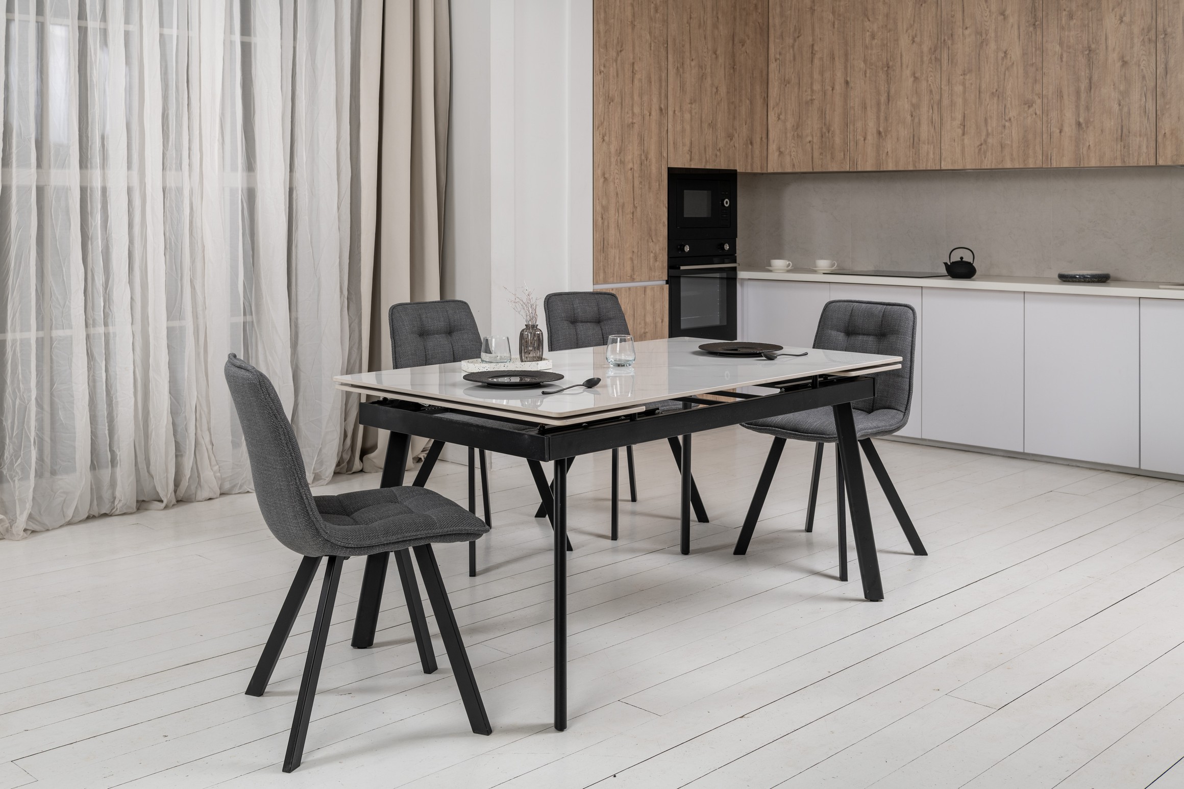 Чорна металева основа надає стільцю сучасного вигляду та забезпечує його стійкість і міцність. Контраст між оббивкою айворі та чорними ніжками створює стильний і збалансований образ.