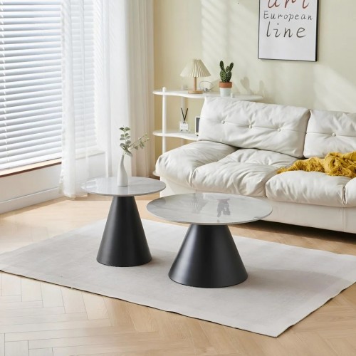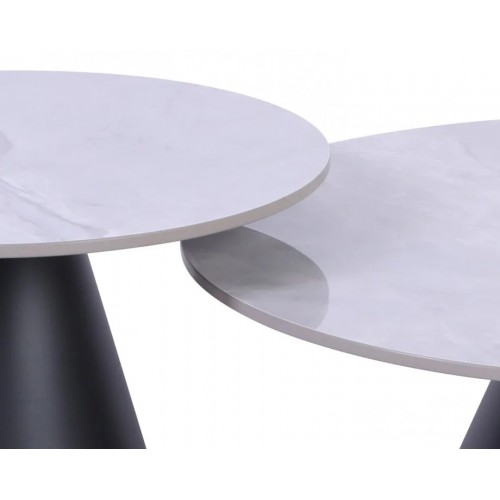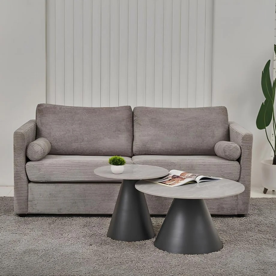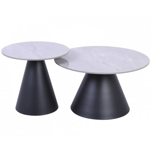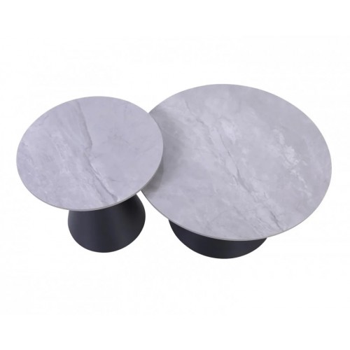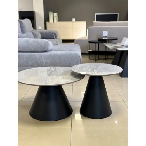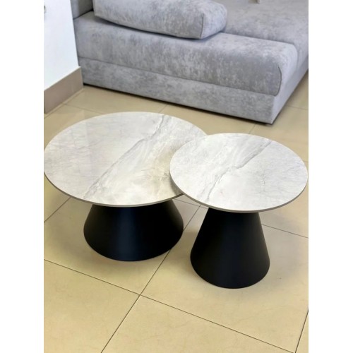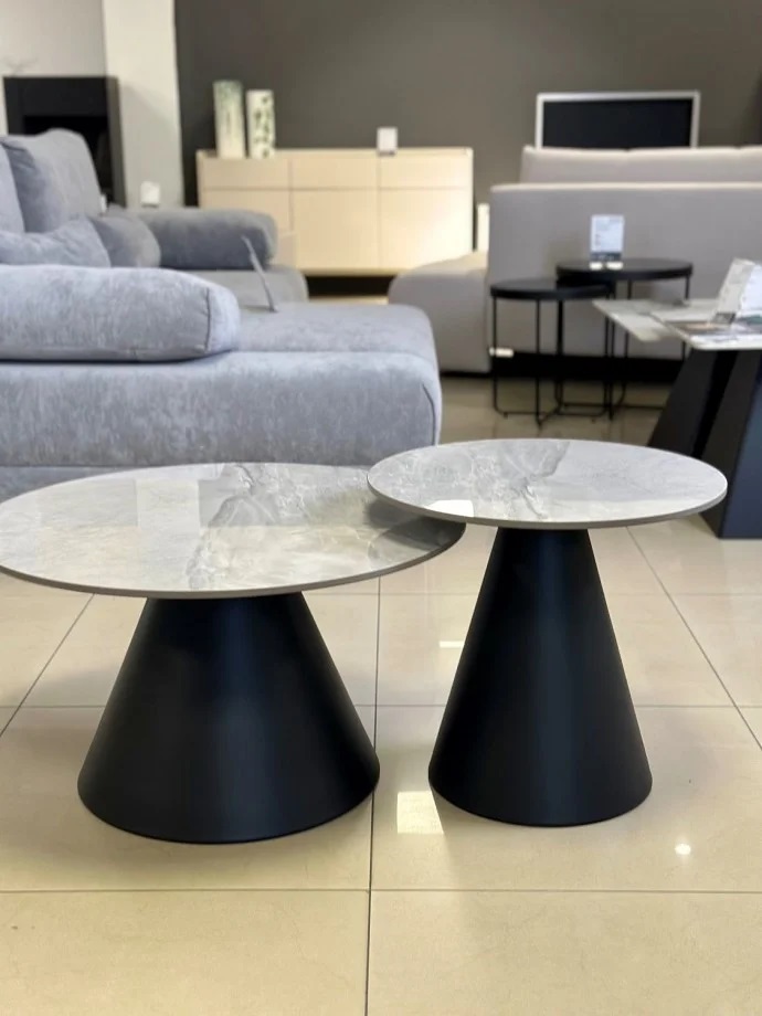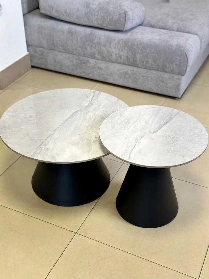 Обновіть свою вітальню комплектом журнальних столиків, що поєднує сучасний дизайн та практичність. Ці стильні столи із сірим глянцем та ефектом мармуру створять елегантну атмосферу завдяки якості матеріалів та розумним рішенням. Унікальна комбінація спеченого каменю та металу не тільки підкреслює естетичні якості меблів, але й забезпечує тривалу експлуатацію, роблячи їх ідеальними для прийому гостей.
